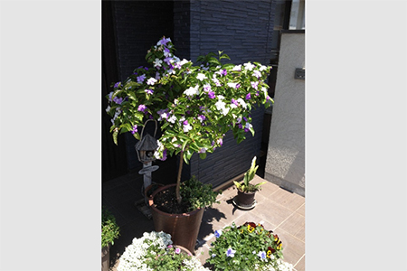 - 地元のご婦人から頂いたニオイバンマツリの鉢植え。紫色の花弁が白色に変わります。足元にはパンジーの寄せ植えが見えます。