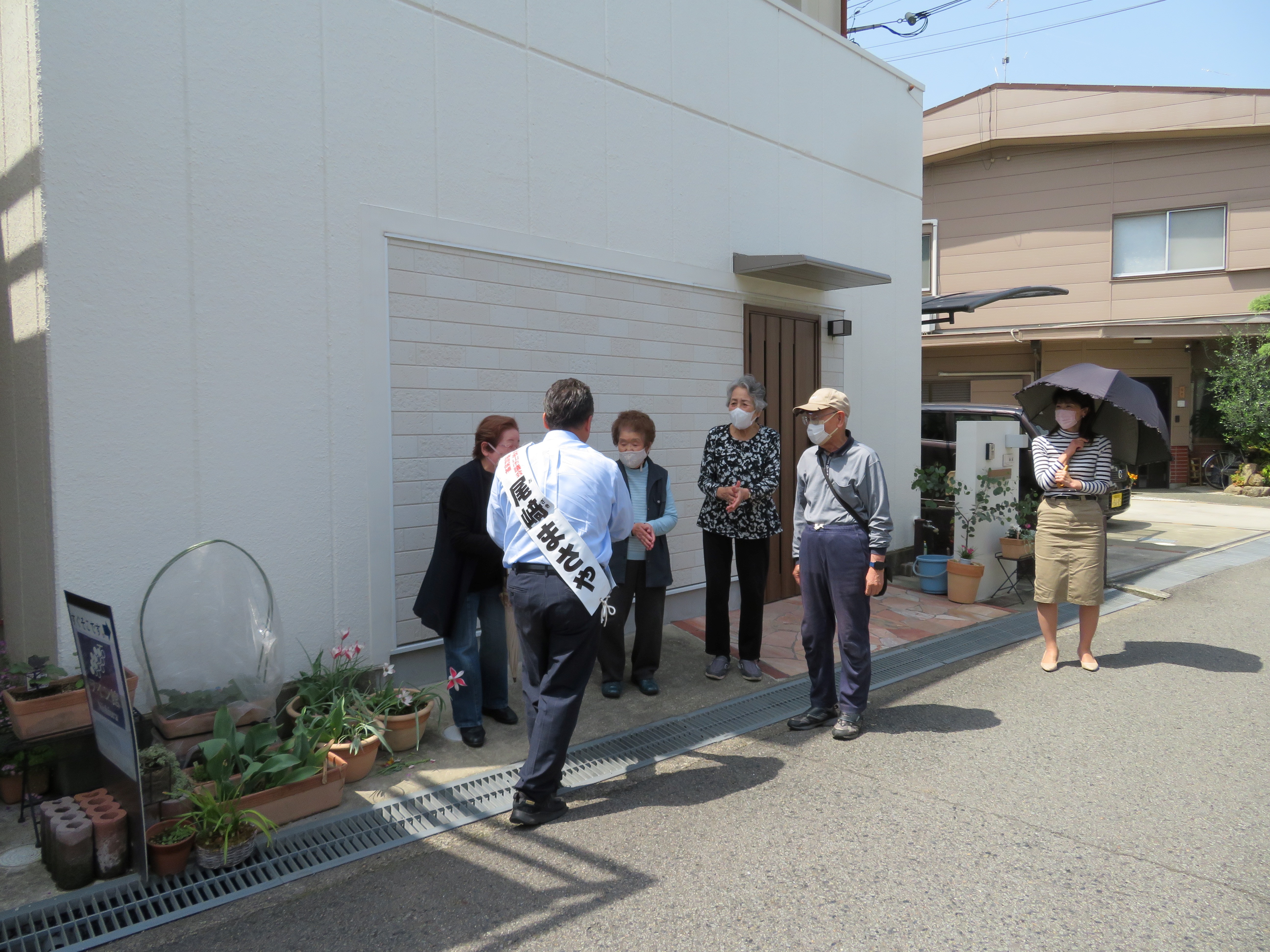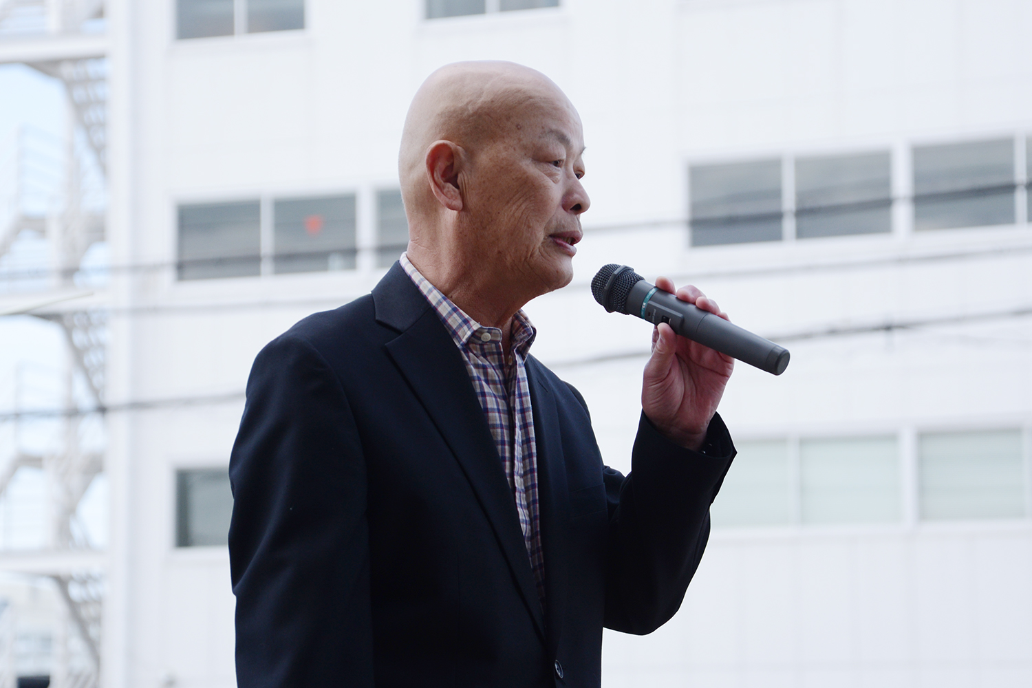 まち歩きの最後、集合場所でハンドマイクによる小西会長の地区の方々にお礼の挨拶。