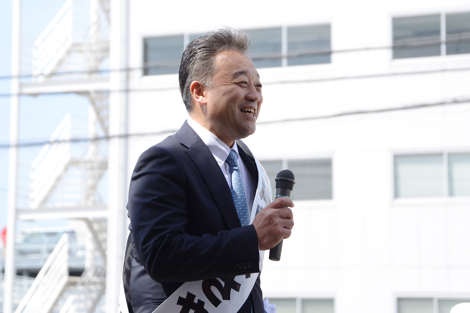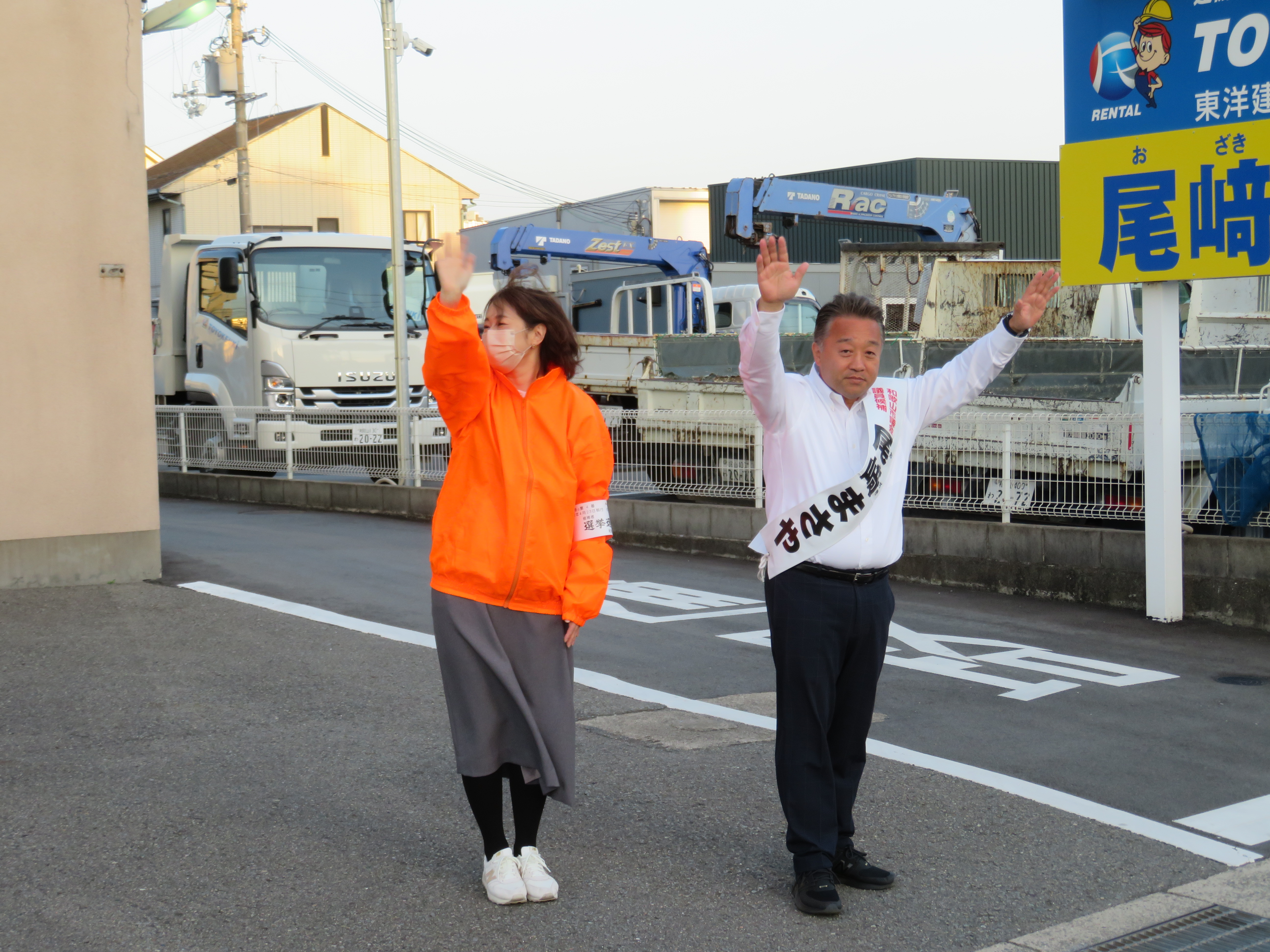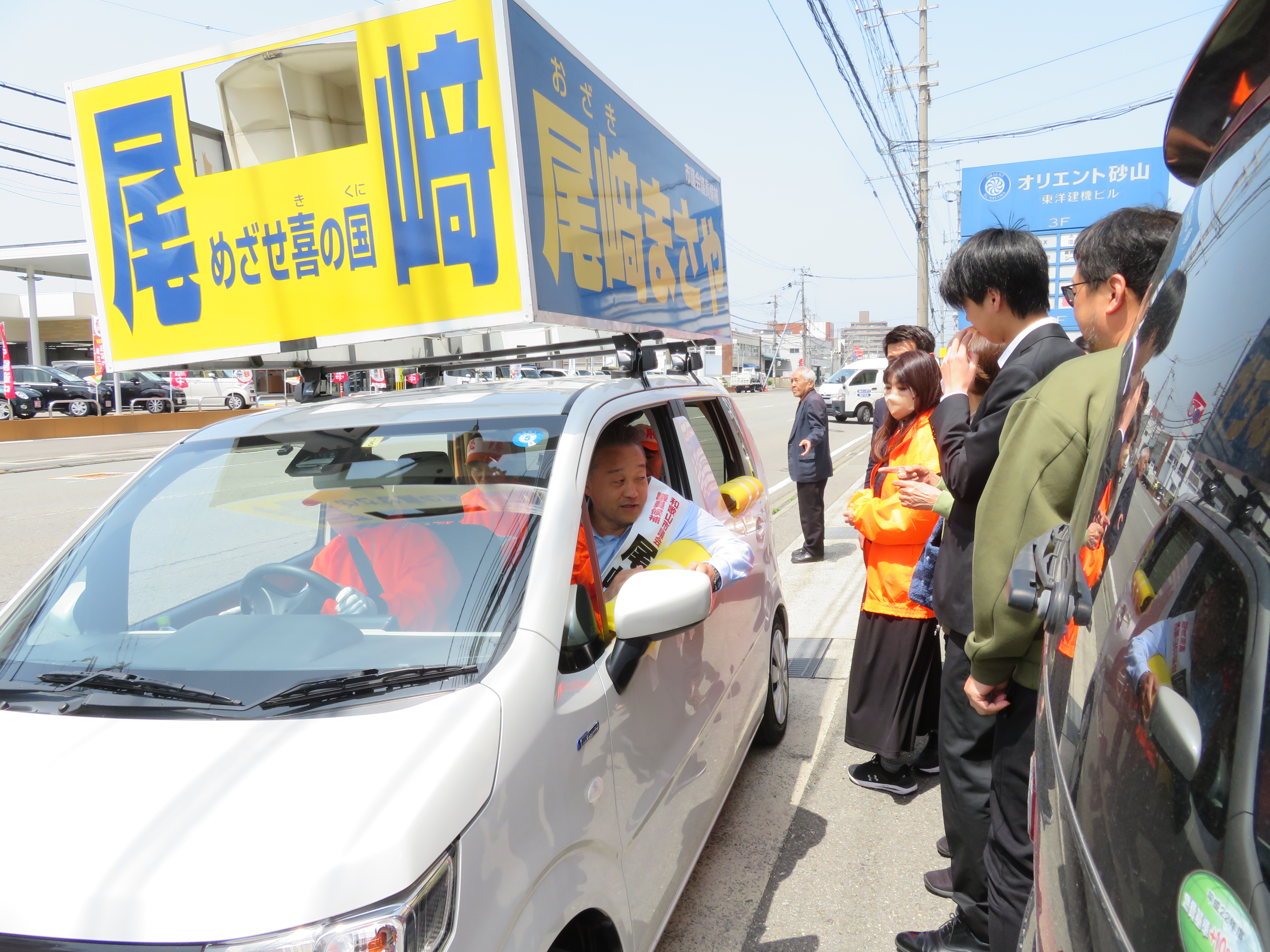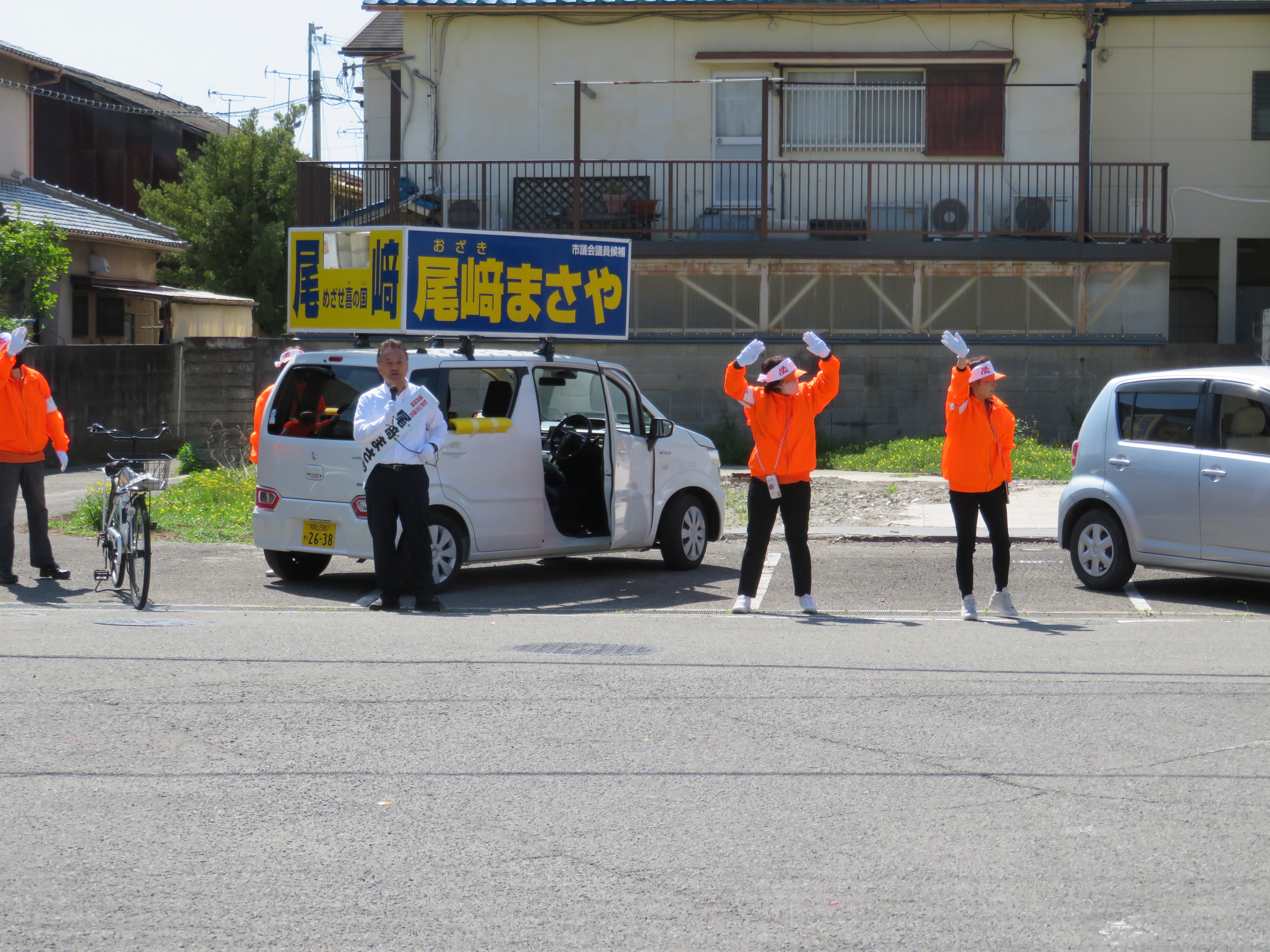 4月16日(日) 選挙運動初日、街頭で手を振る尾﨑まさや候補