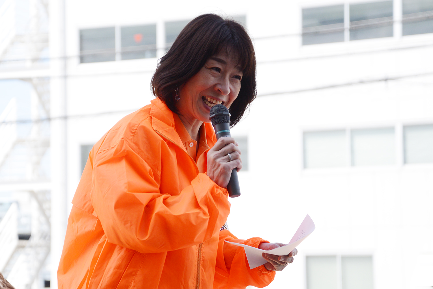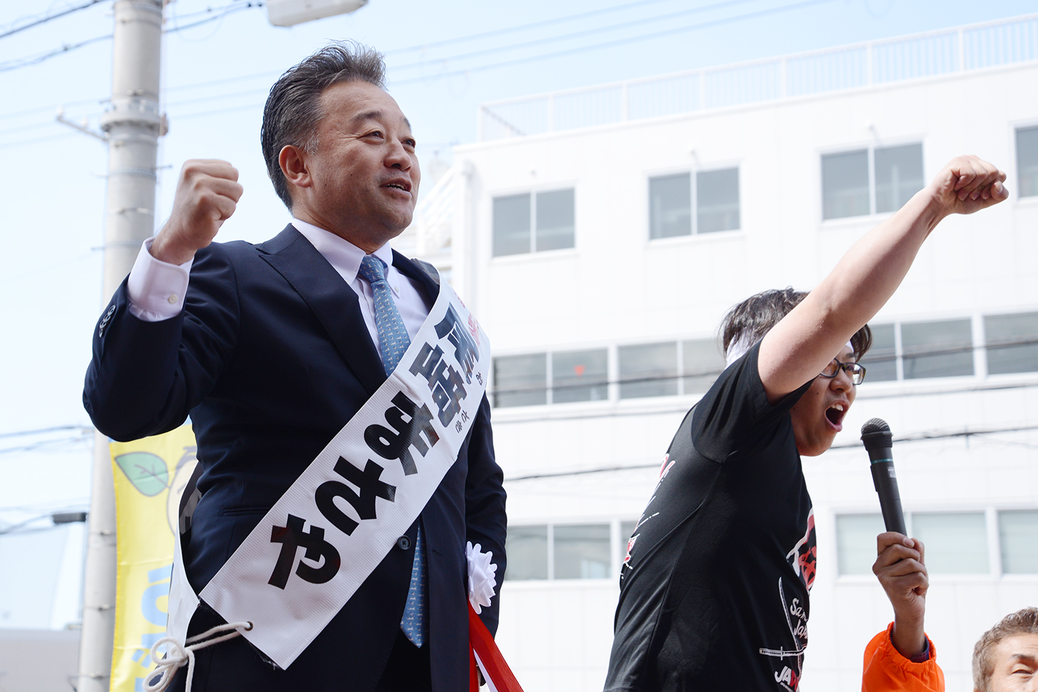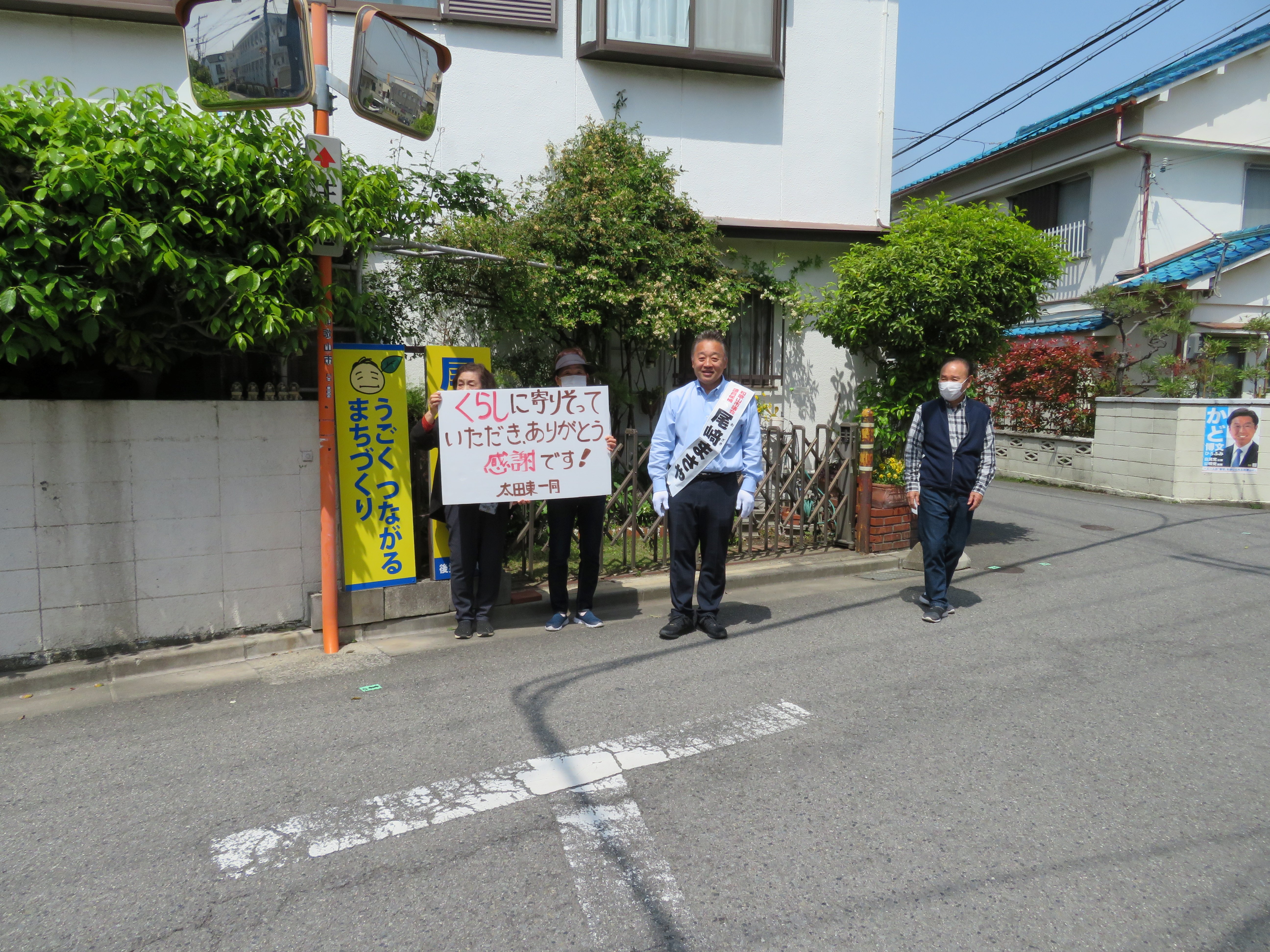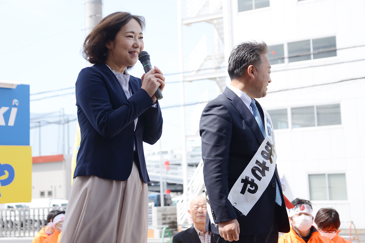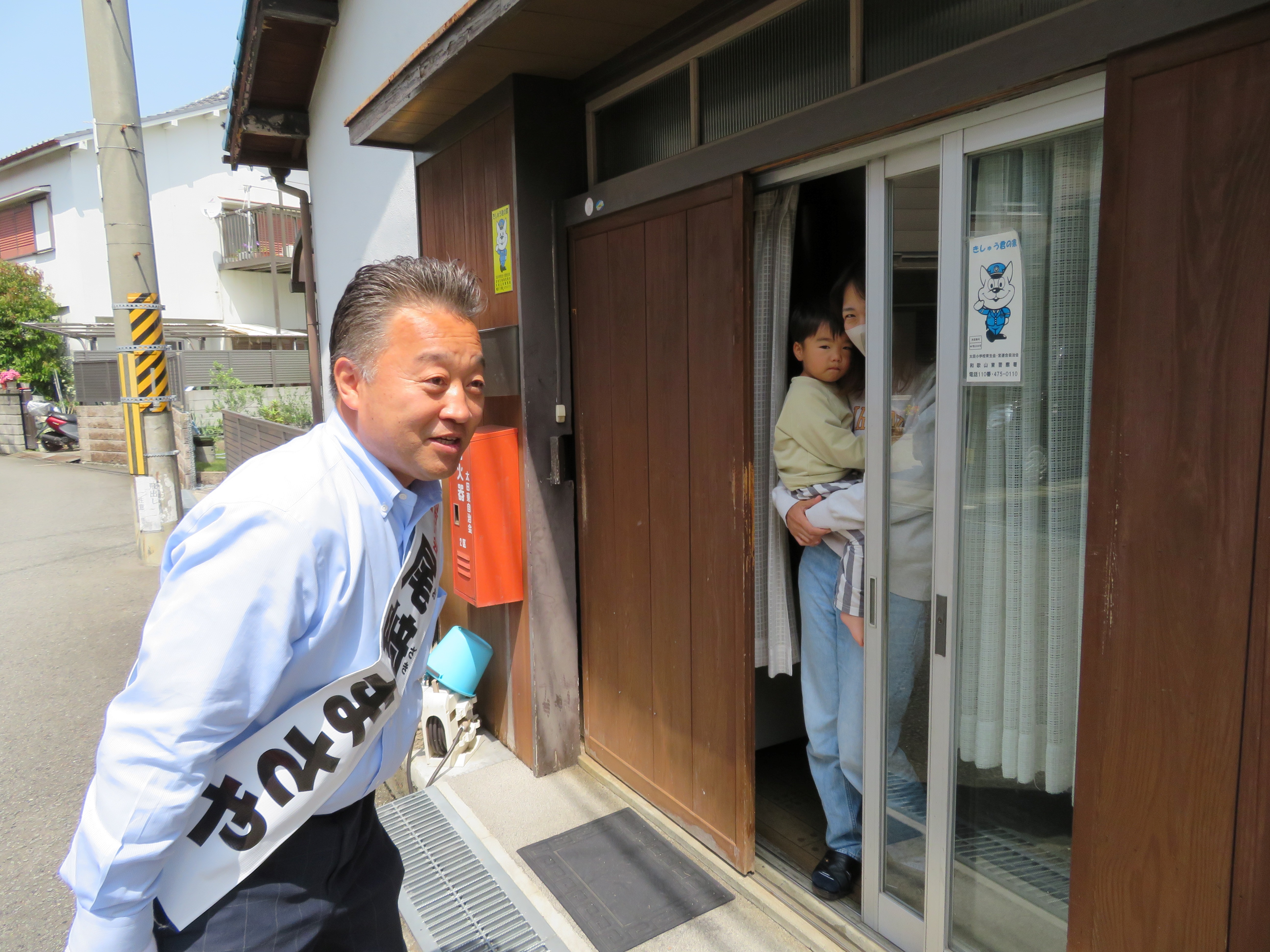 4月16日(日) 選挙運動初日、街頭で手を振る尾﨑まさや候補