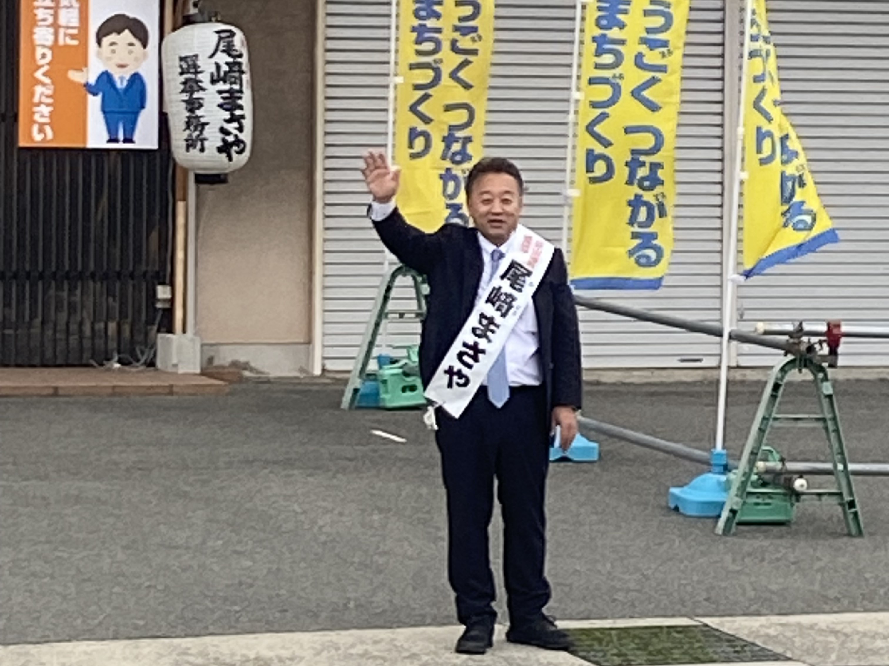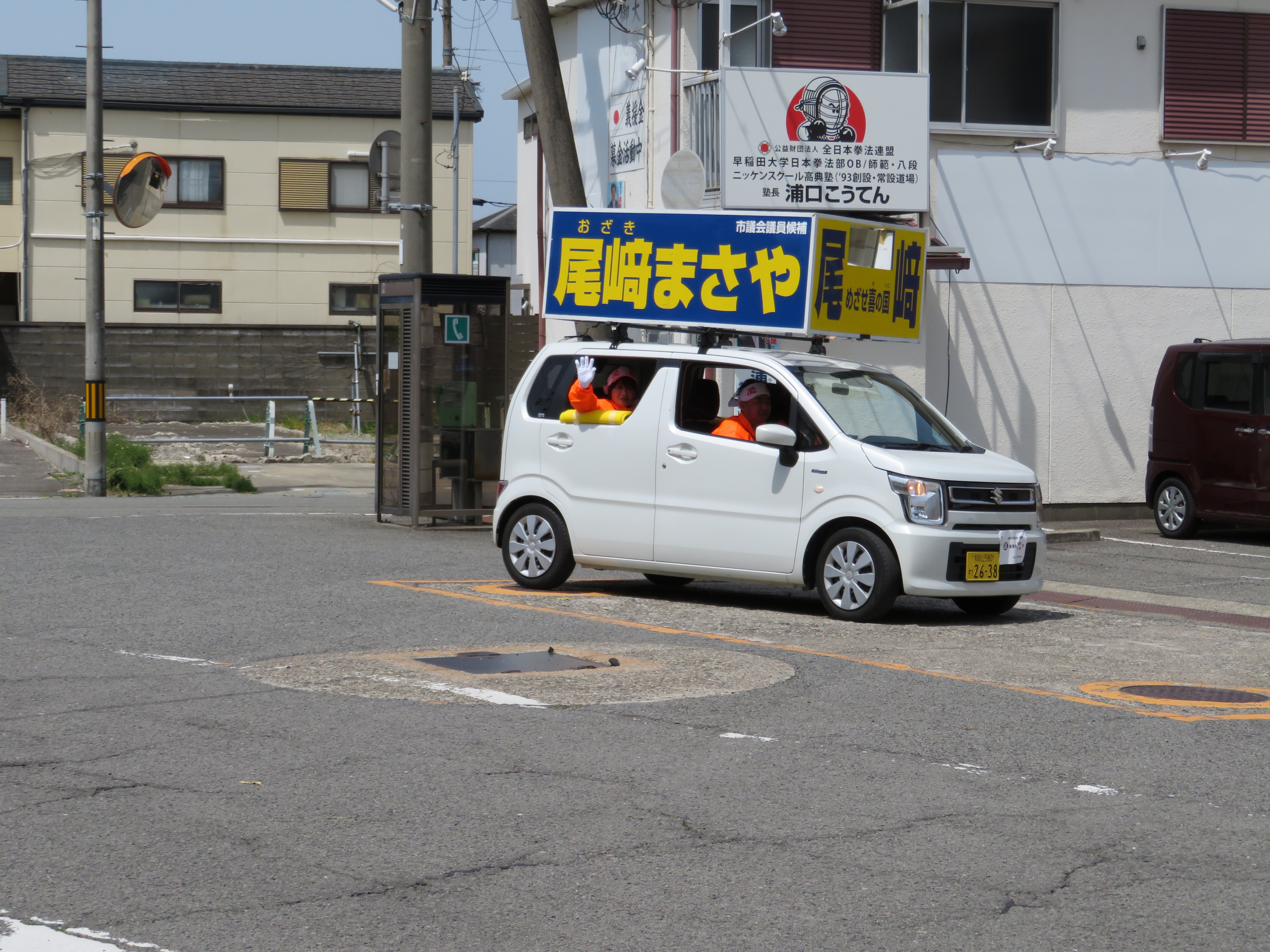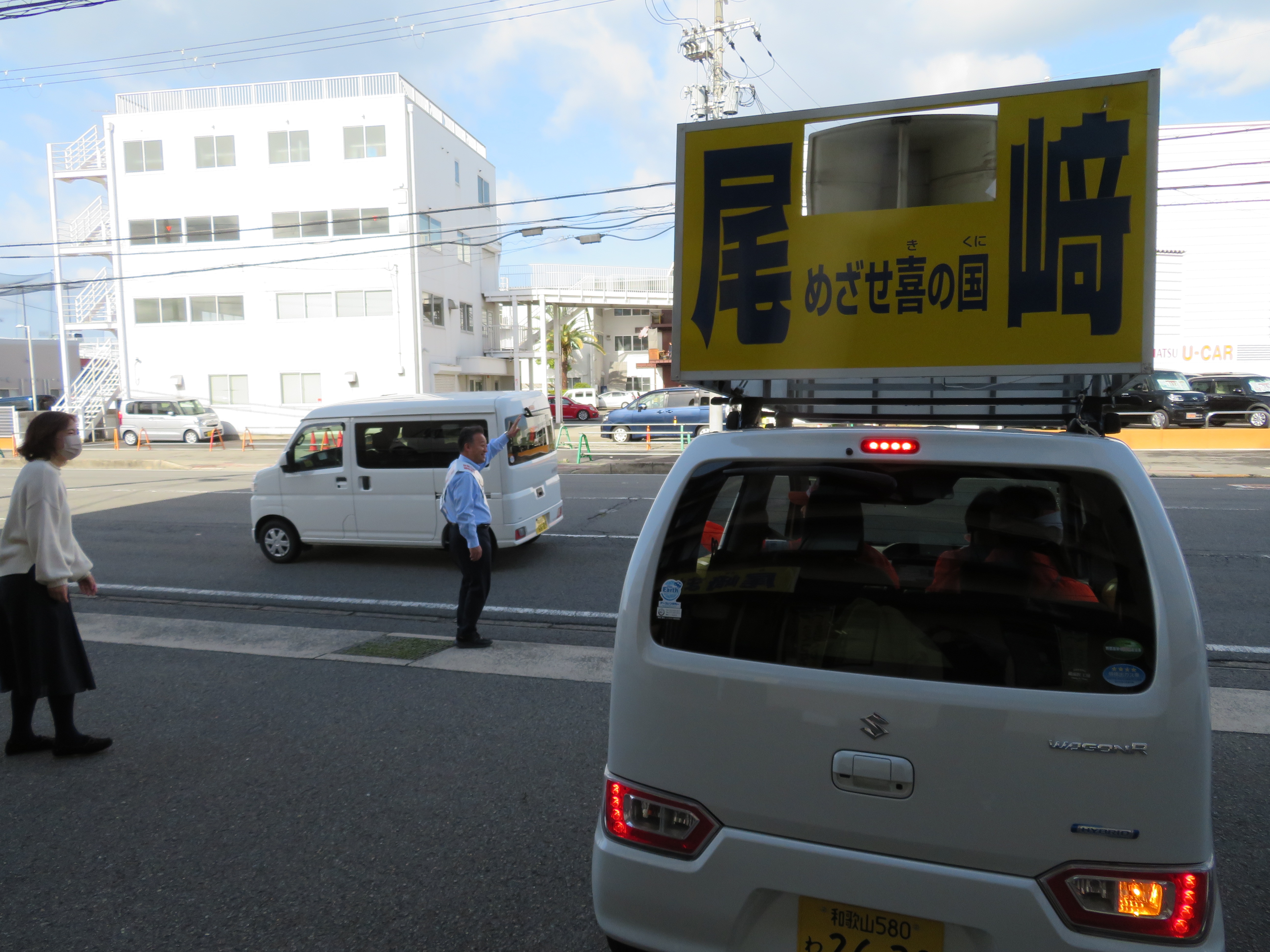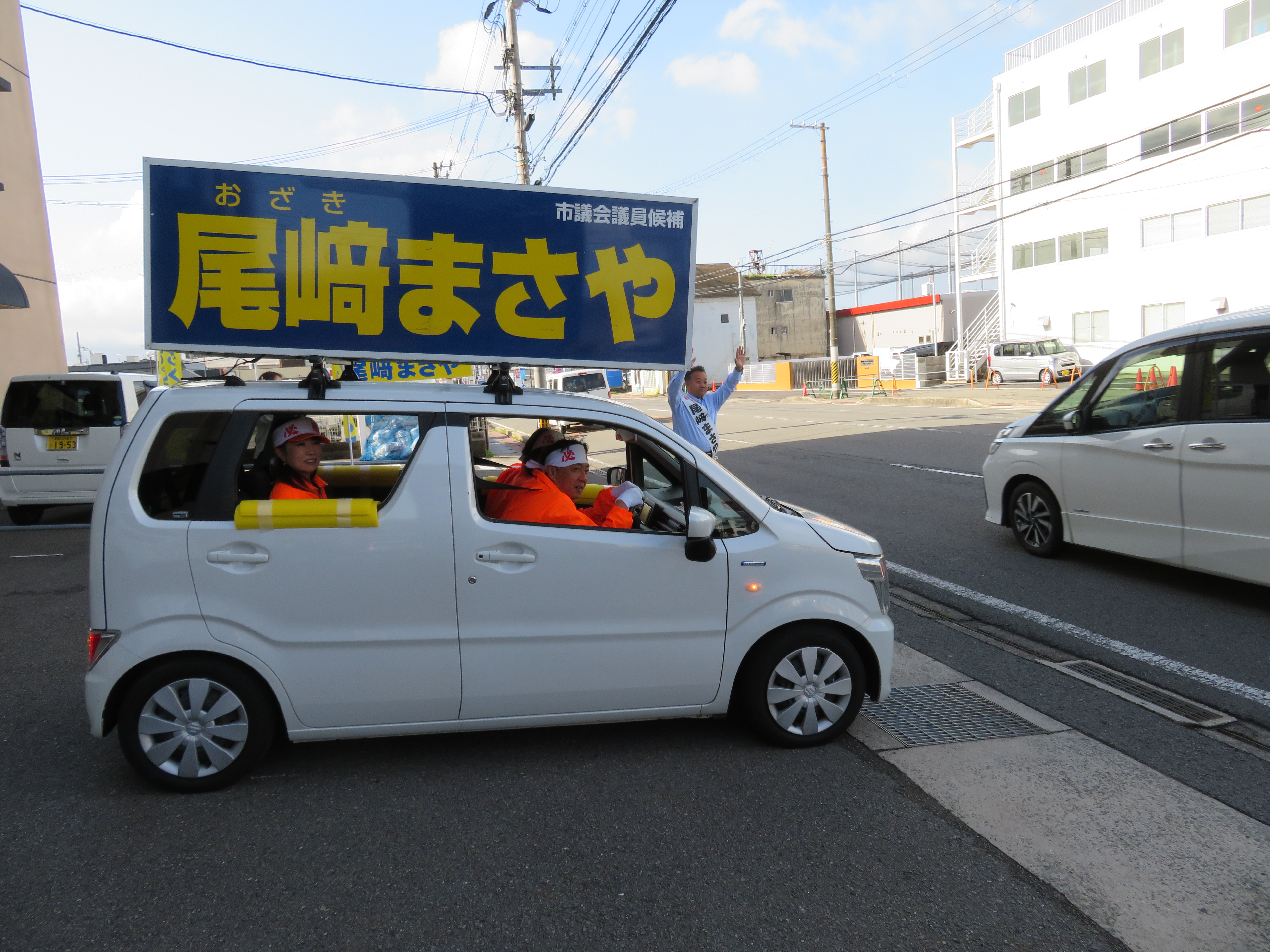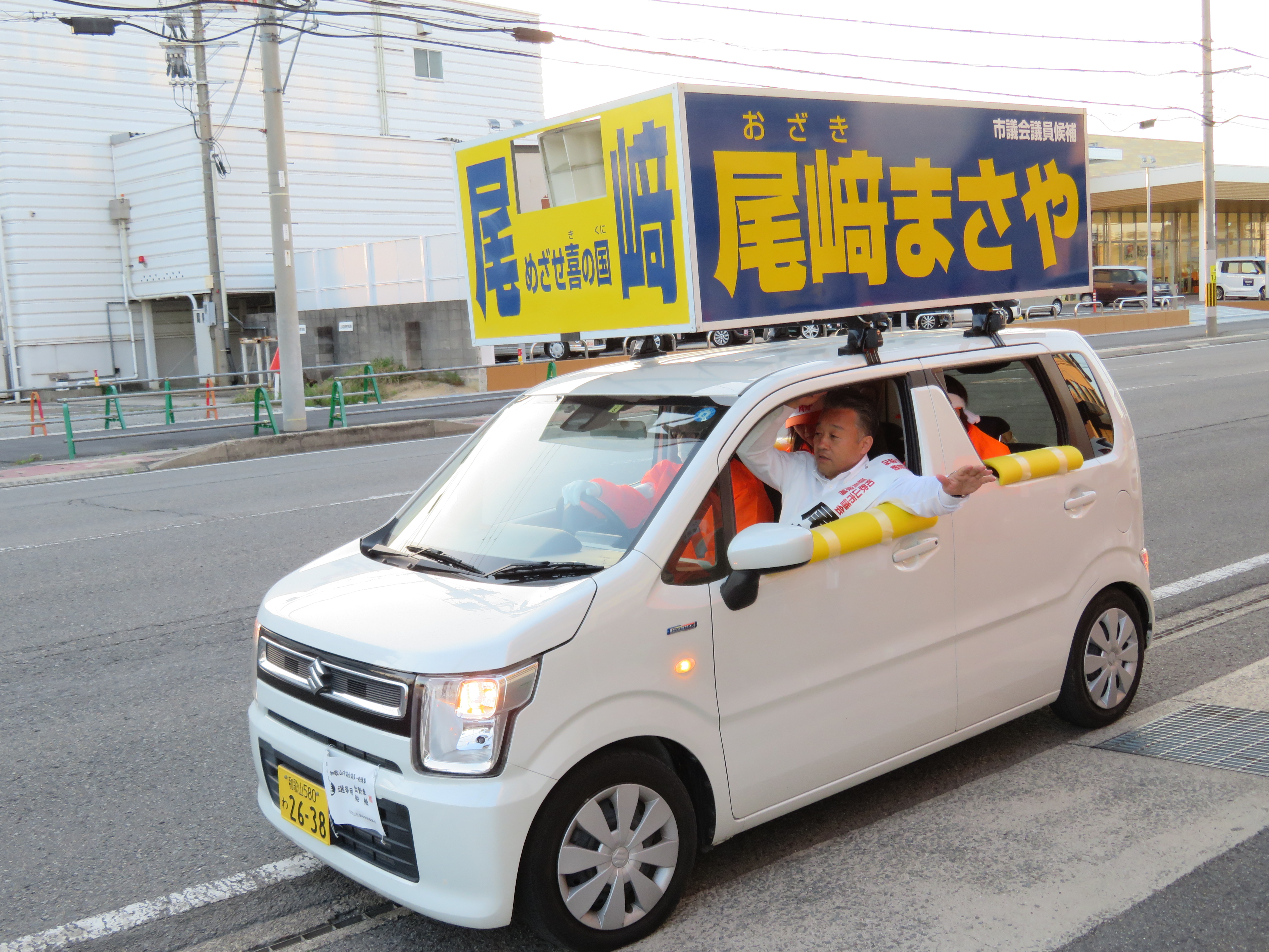 選挙運動もいよいよ大詰めとなりました。「尾﨑まさや候補者」は、大浦街道沿いに立ち、手を振り最後のお願いをしています。街宣車にも飛び乗り、自らマイクを持ち、最後の訴えをおこなっています。