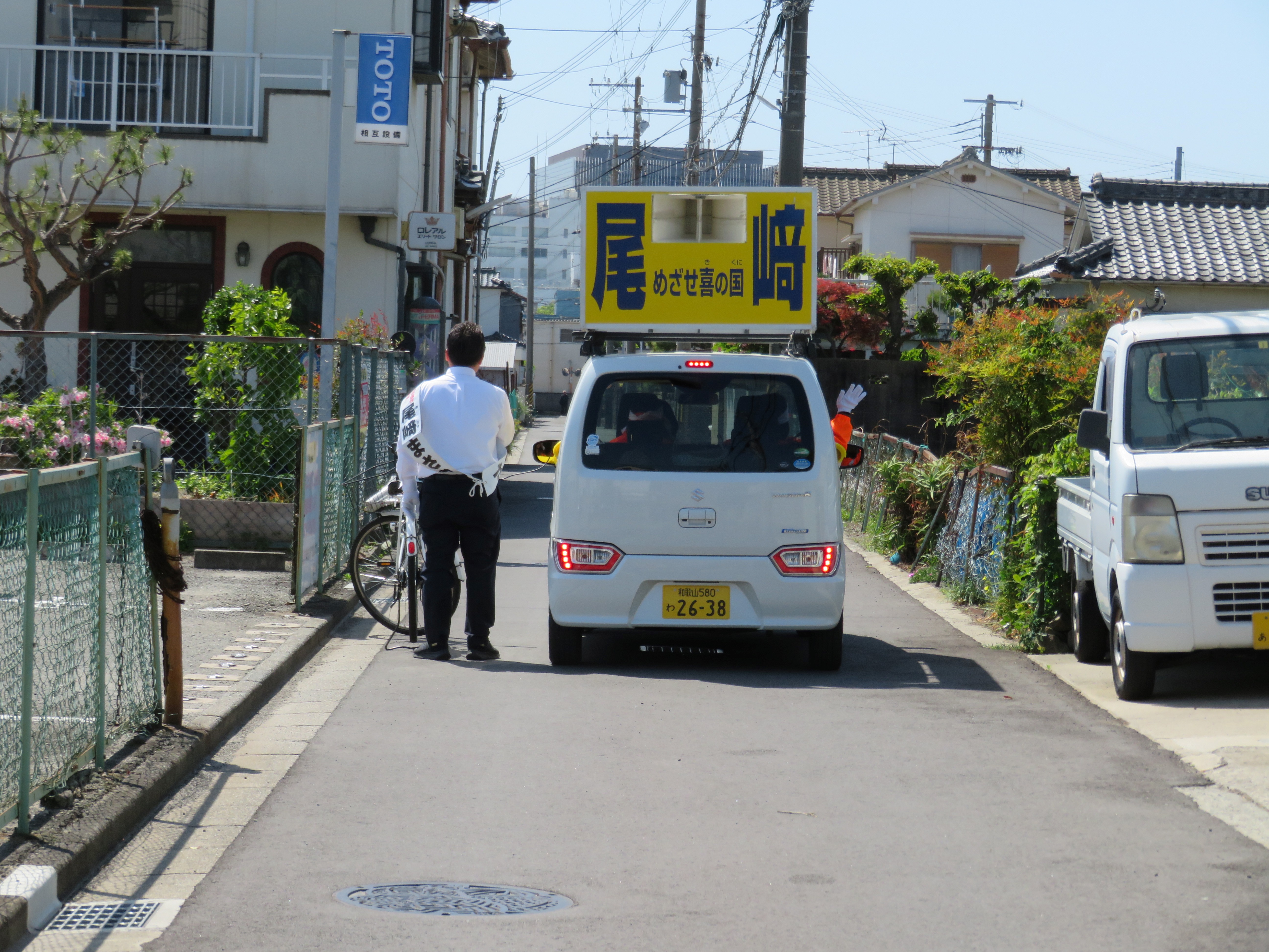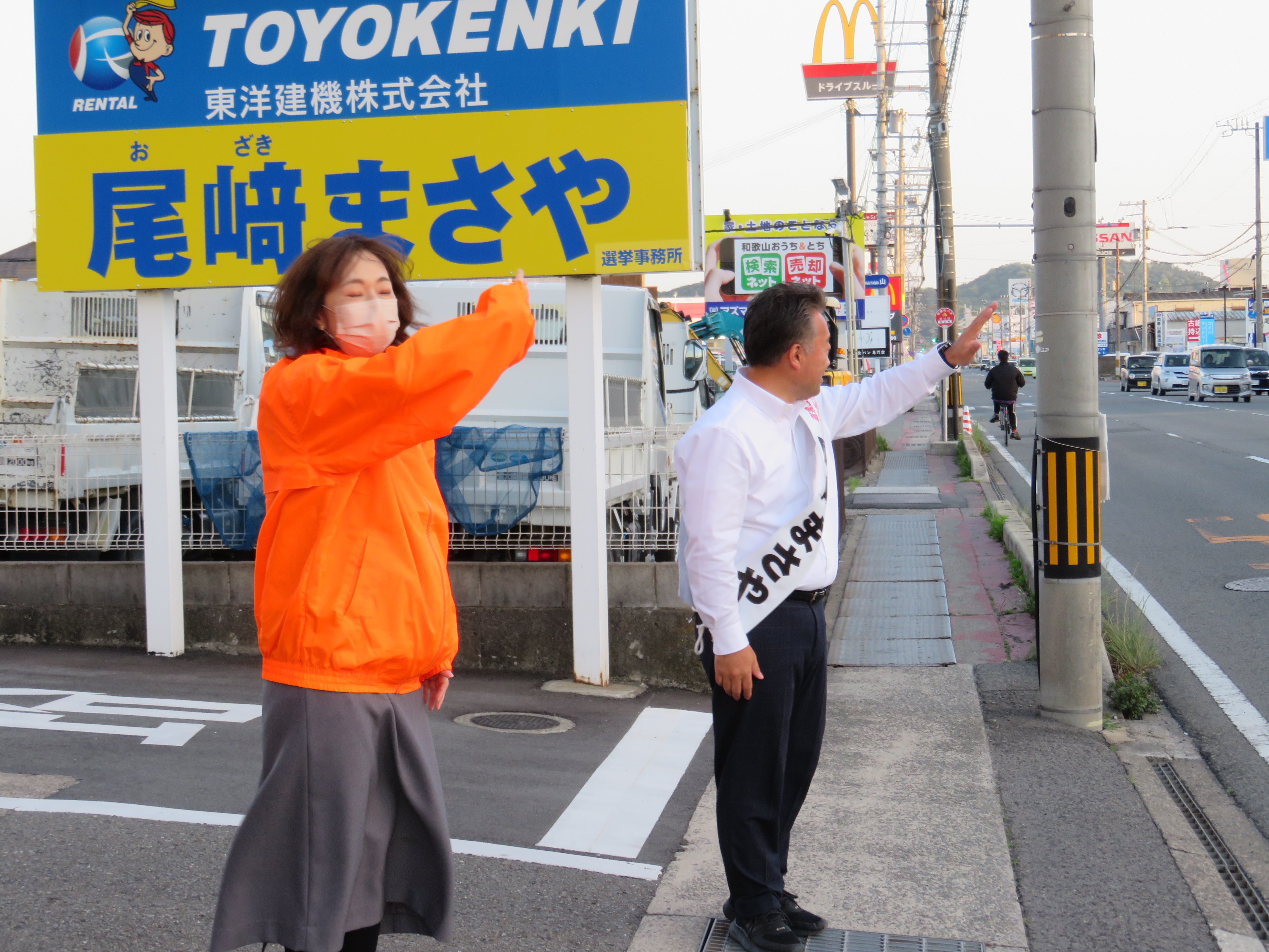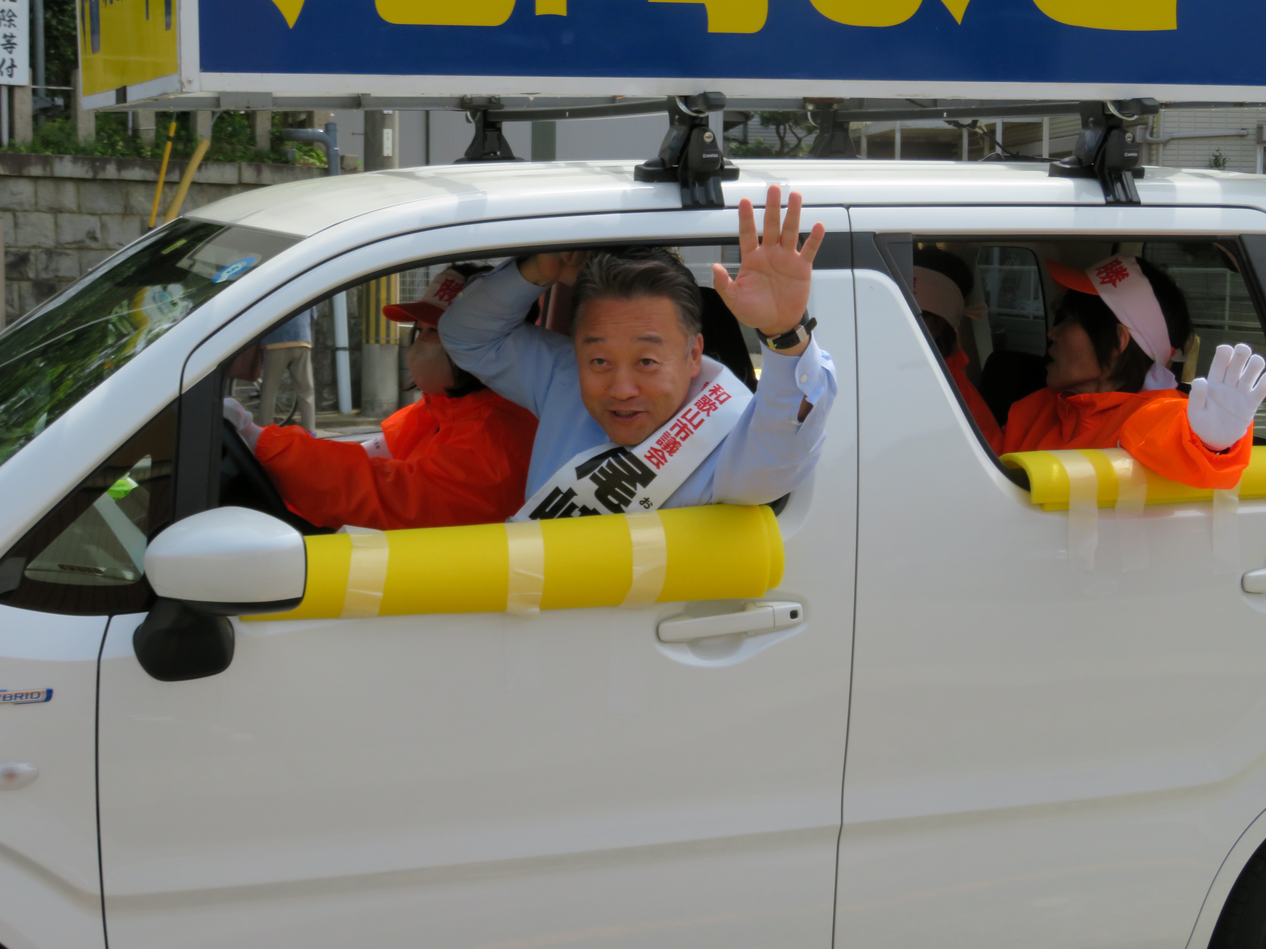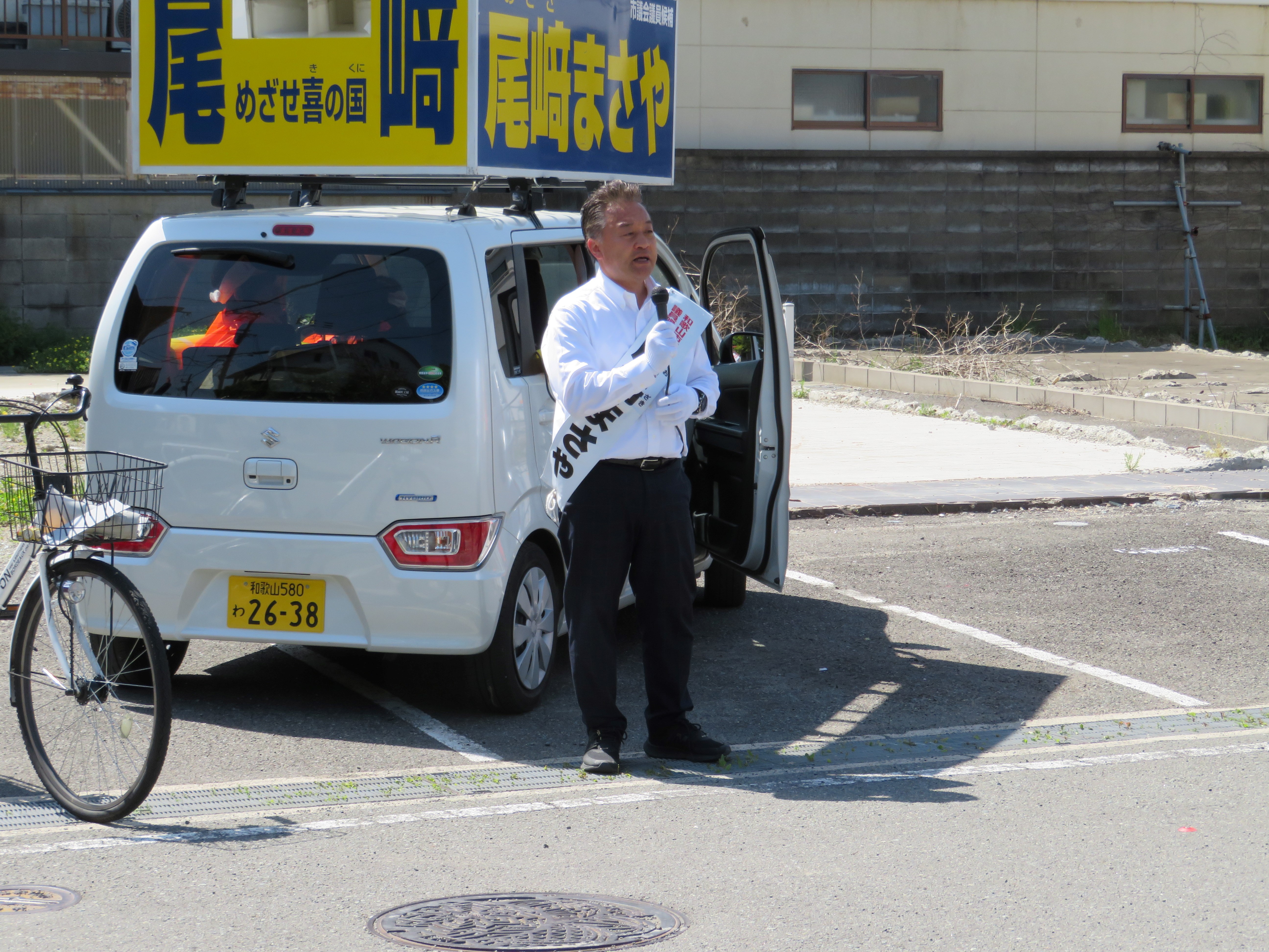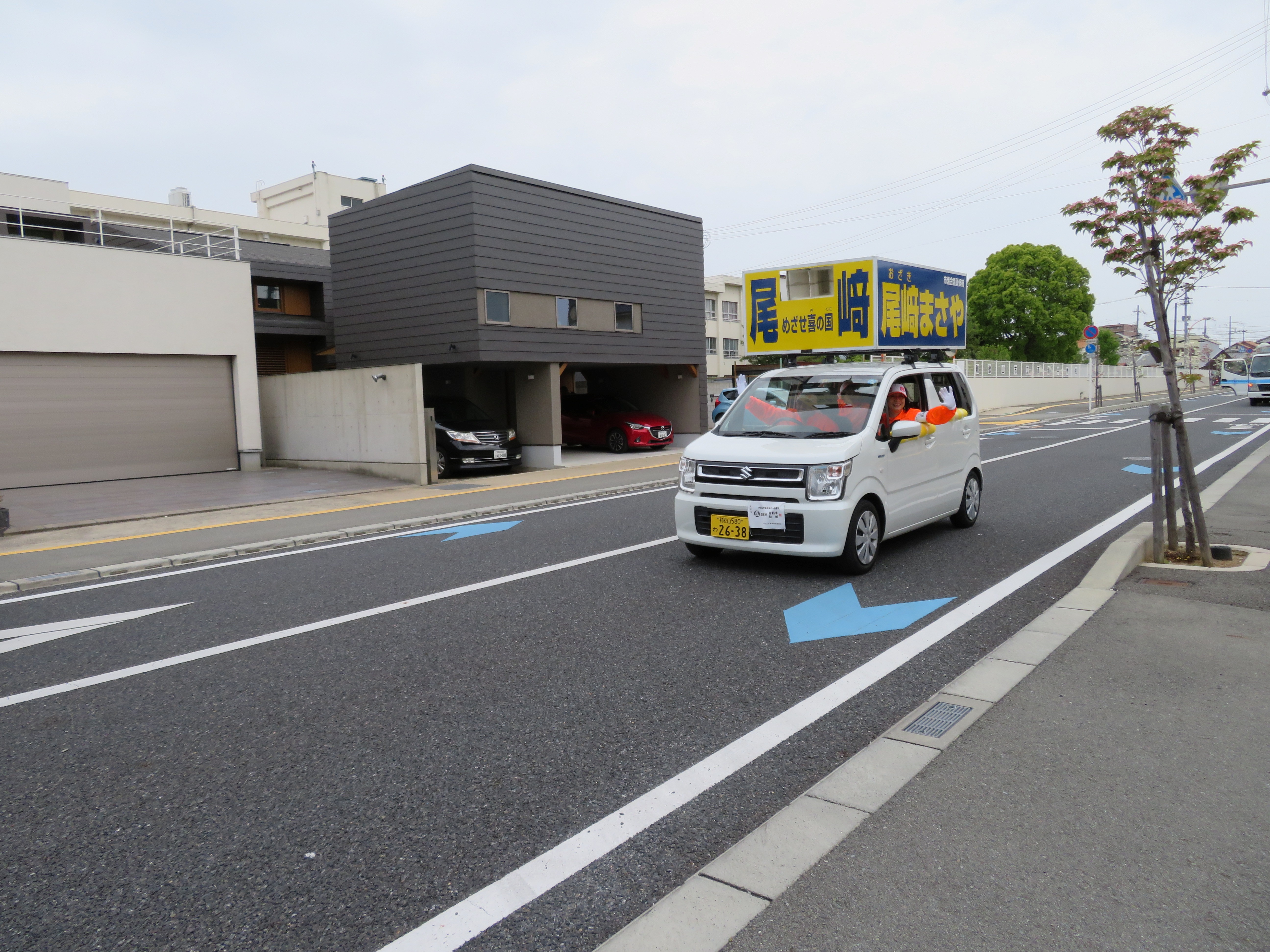 選挙運動もいよいよ大詰めとなりました。「尾﨑まさや候補者」は、大浦街道沿いに立ち、手を振り最後のお願いをしています。街宣車にも飛び乗り、自らマイクを持ち、最後の訴えをおこなっています。