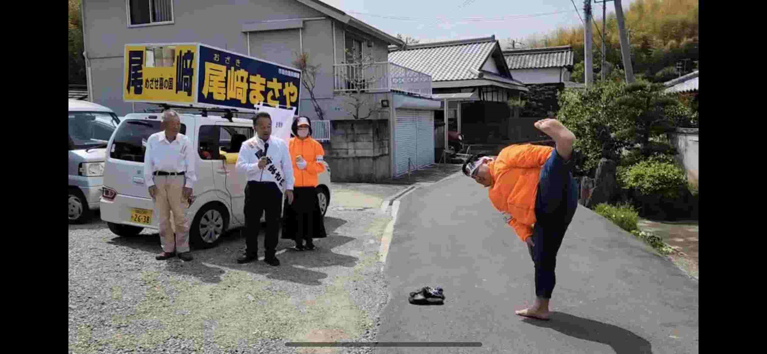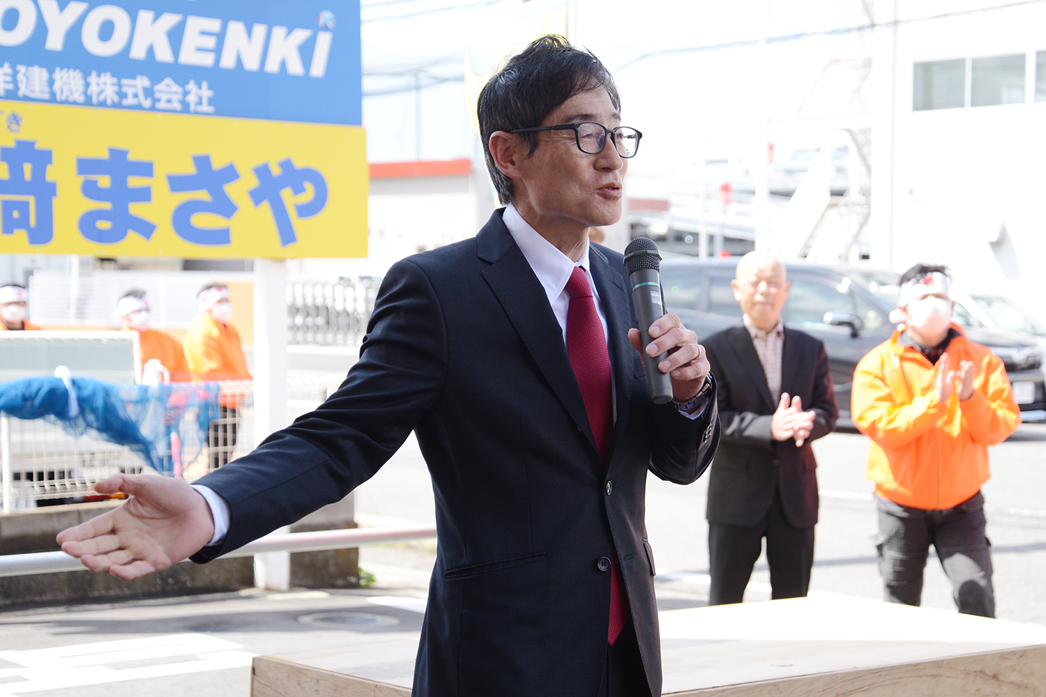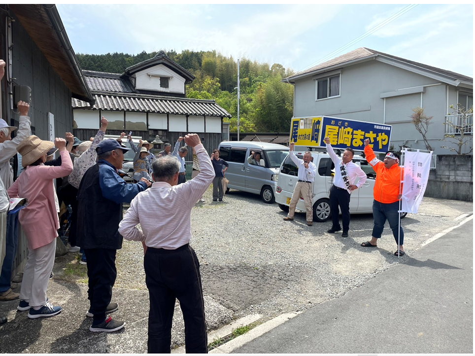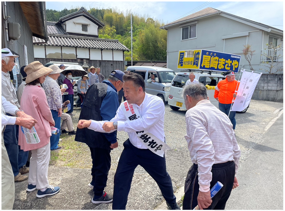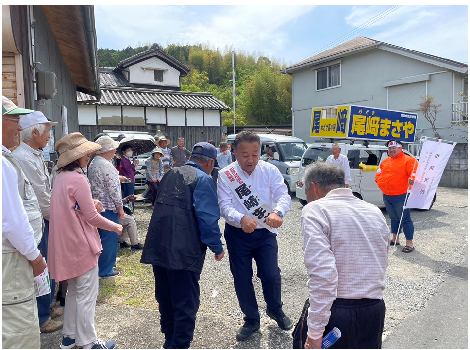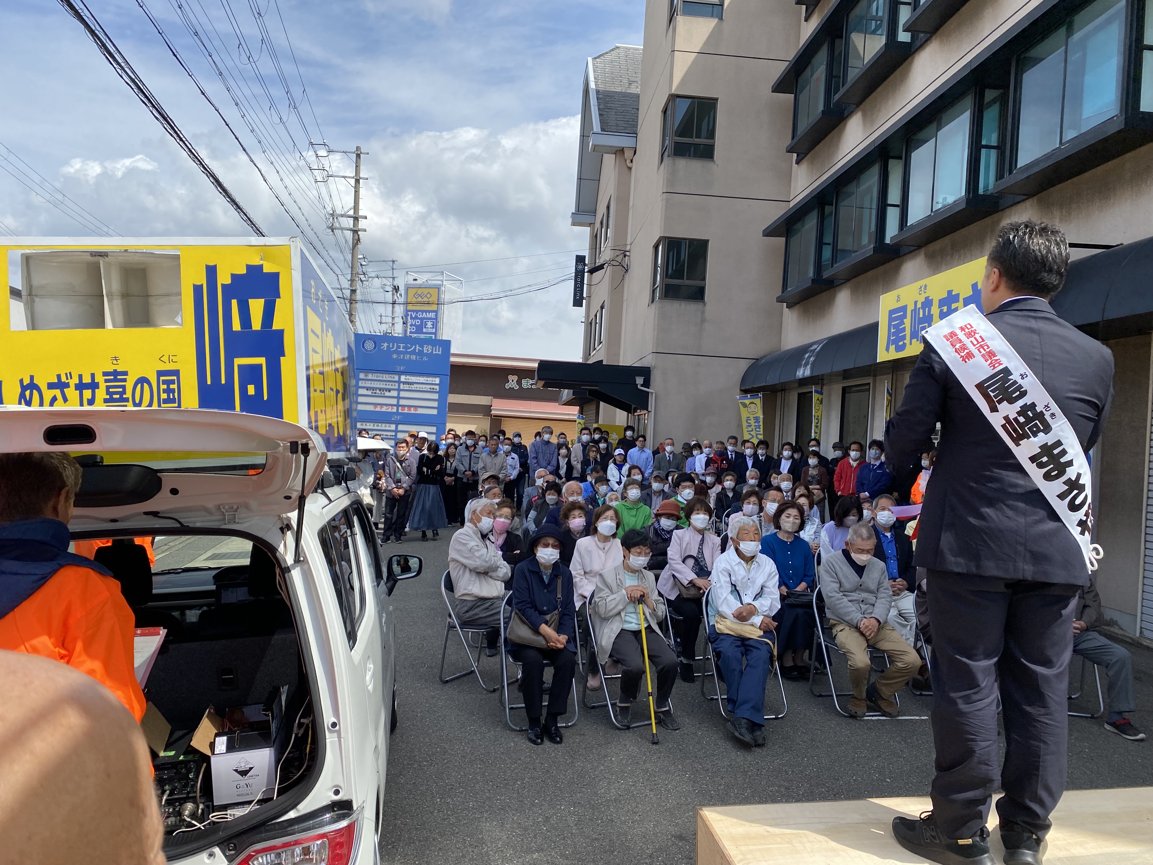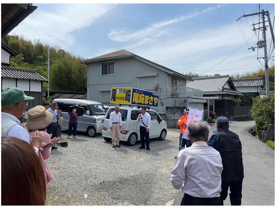 選挙運動もいよいよ大詰めとなりました。「尾﨑まさや候補者」は、大浦街道沿いに立ち、手を振り最後のお願いをしています。街宣車にも飛び乗り、自らマイクを持ち、最後の訴えをおこなっています。