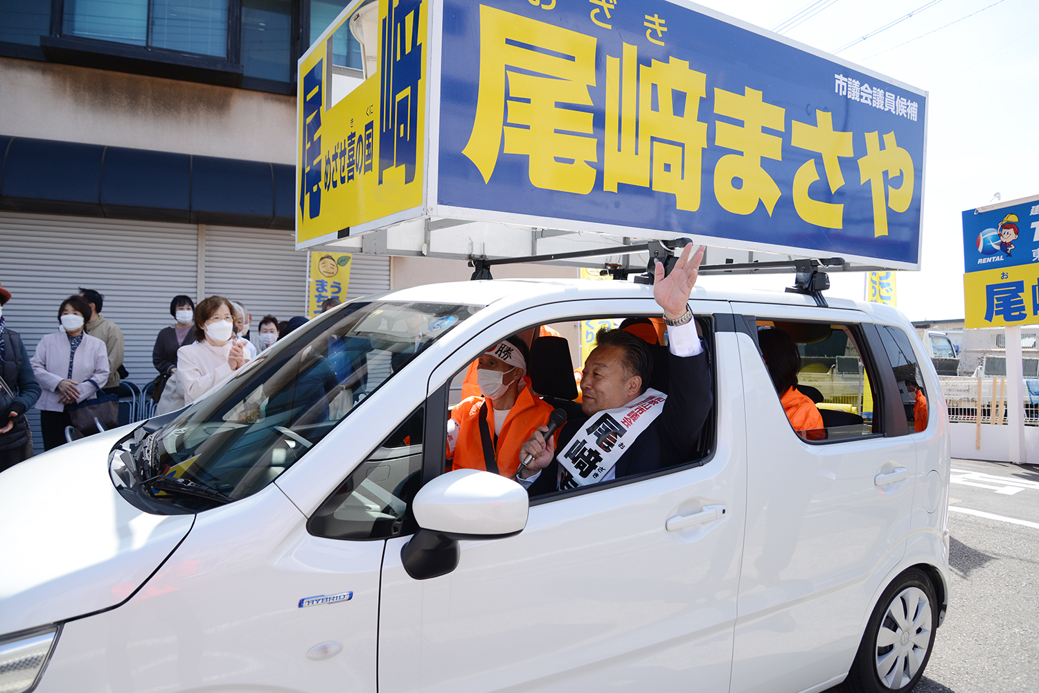 6期目の戦いに向け街宣車に乗り出陣する候補者:尾﨑まさや