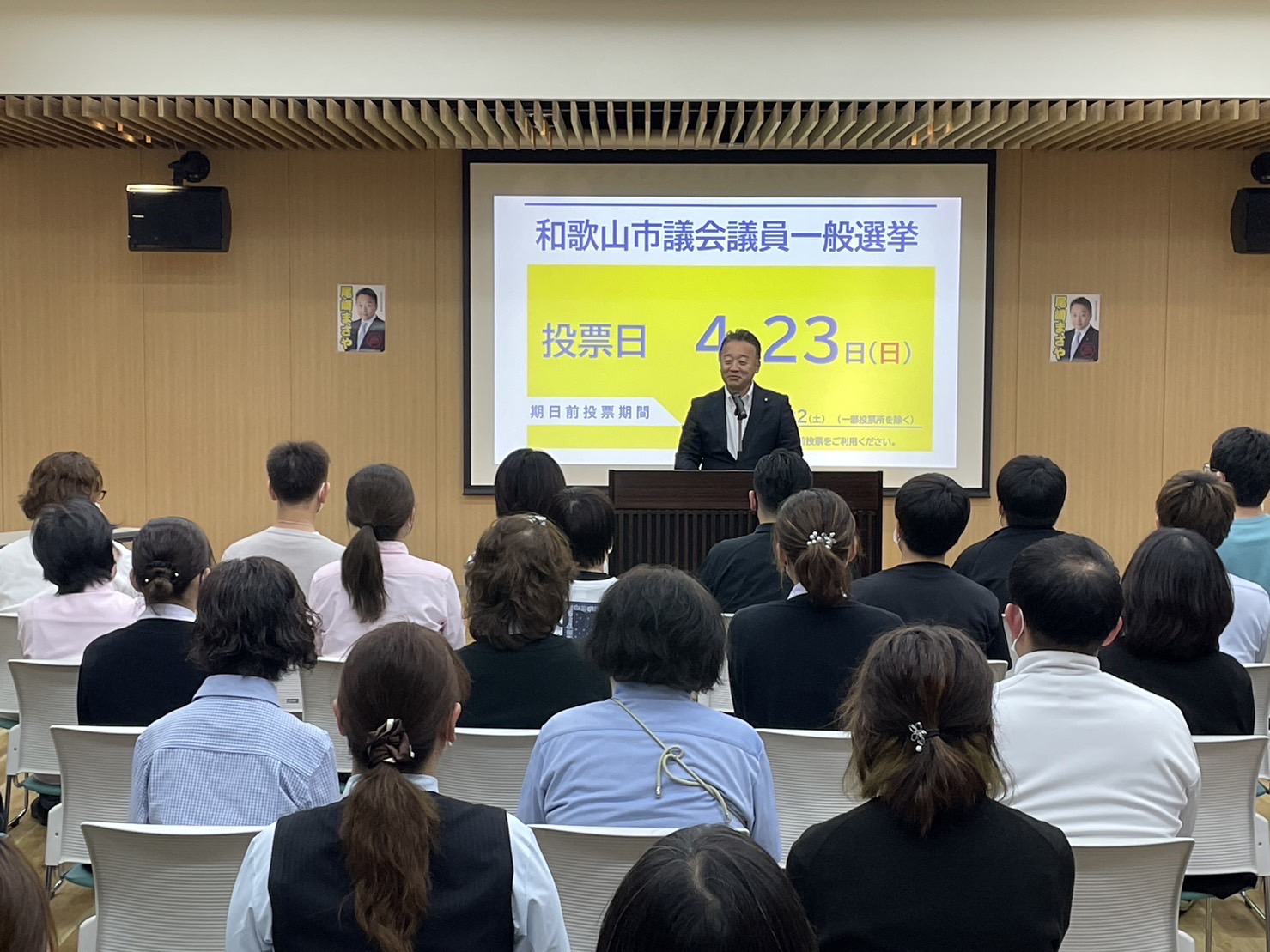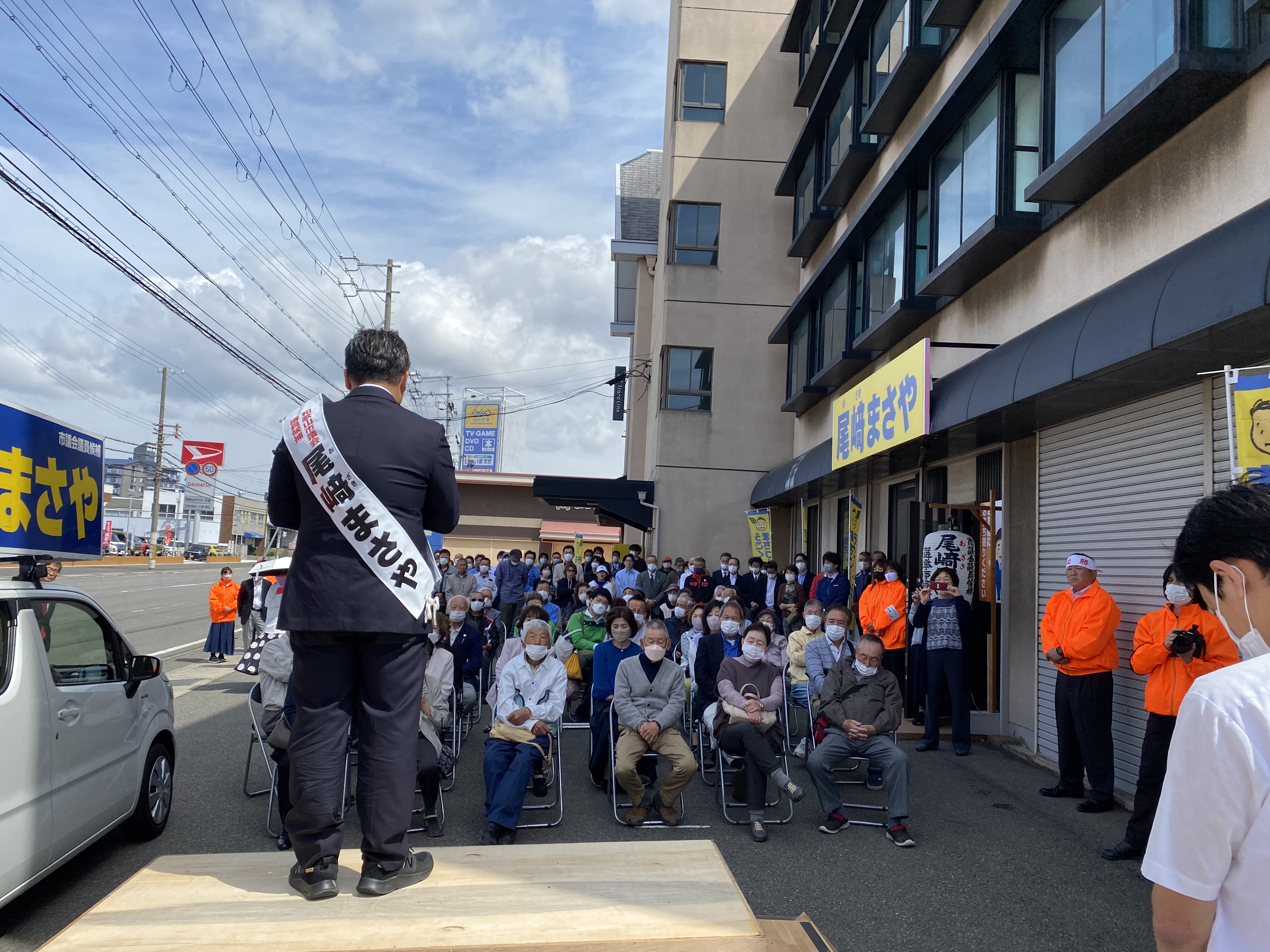 晴天のもと、300人を超える支持者の方が和歌山市議会議員候補尾崎まさや出陣式のためにご参集していただきました。皆様のお顔を拝見し、6期目の戦いですが、感謝に身の引き締まる思いです。朝早くから応援に駆けつけて頂いた方々と候補者、事務局からのご挨拶風景です。