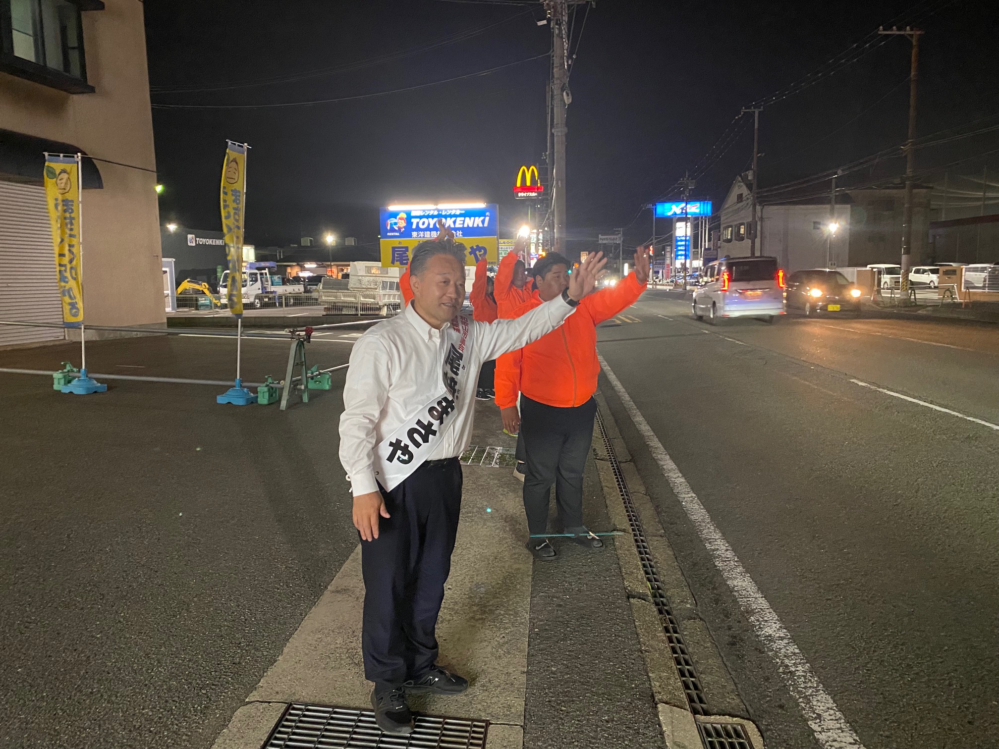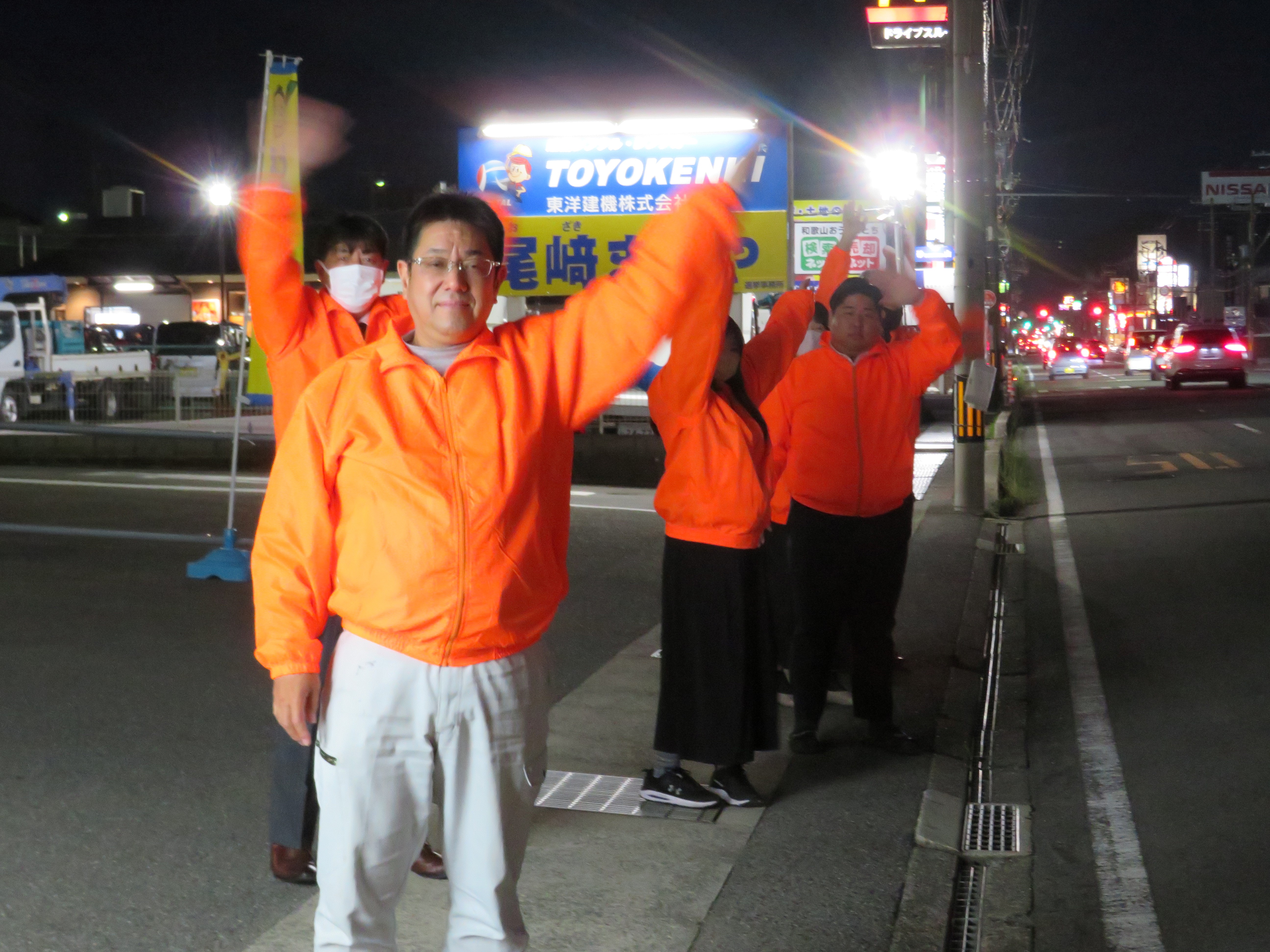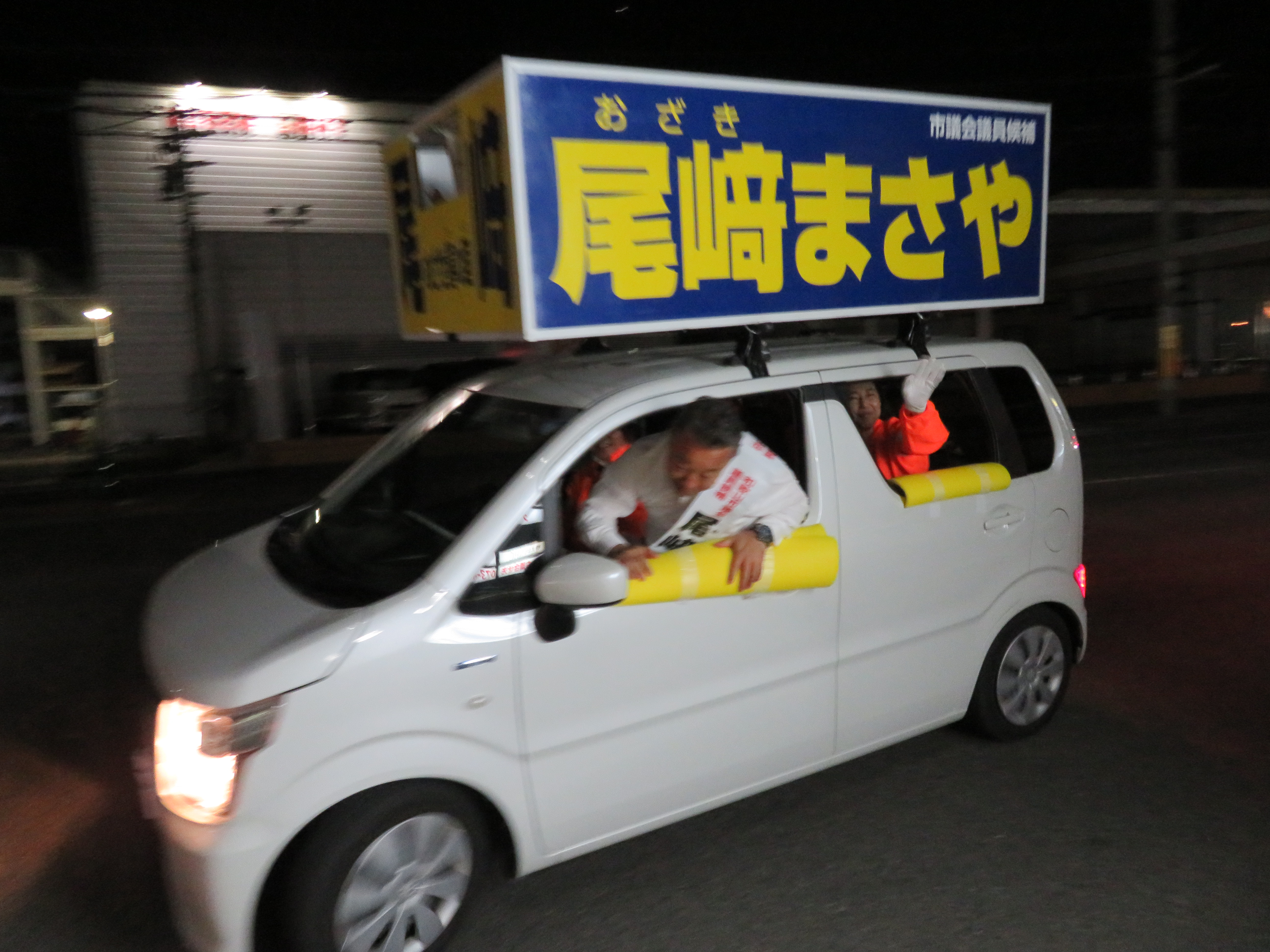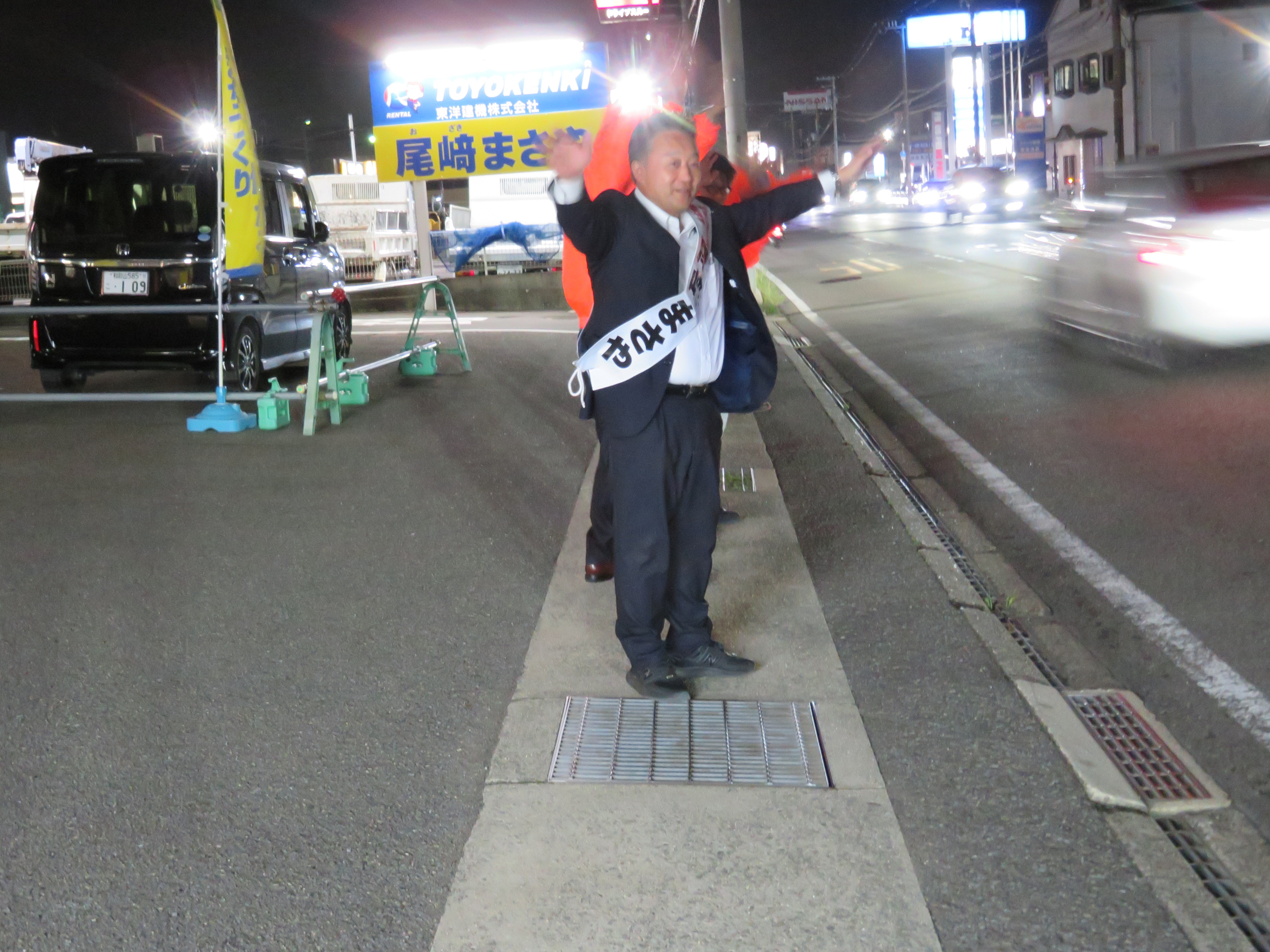 少し寒くなってきた夕闇の中、スタッフ一同、昨夜に続き尾﨑まさや候補者を先頭に、大浦街道沿いに出て手を振りました。候補者、スタッフ一同は、なおも元気です。手を振り続けていると街宣車が帰ってきました。