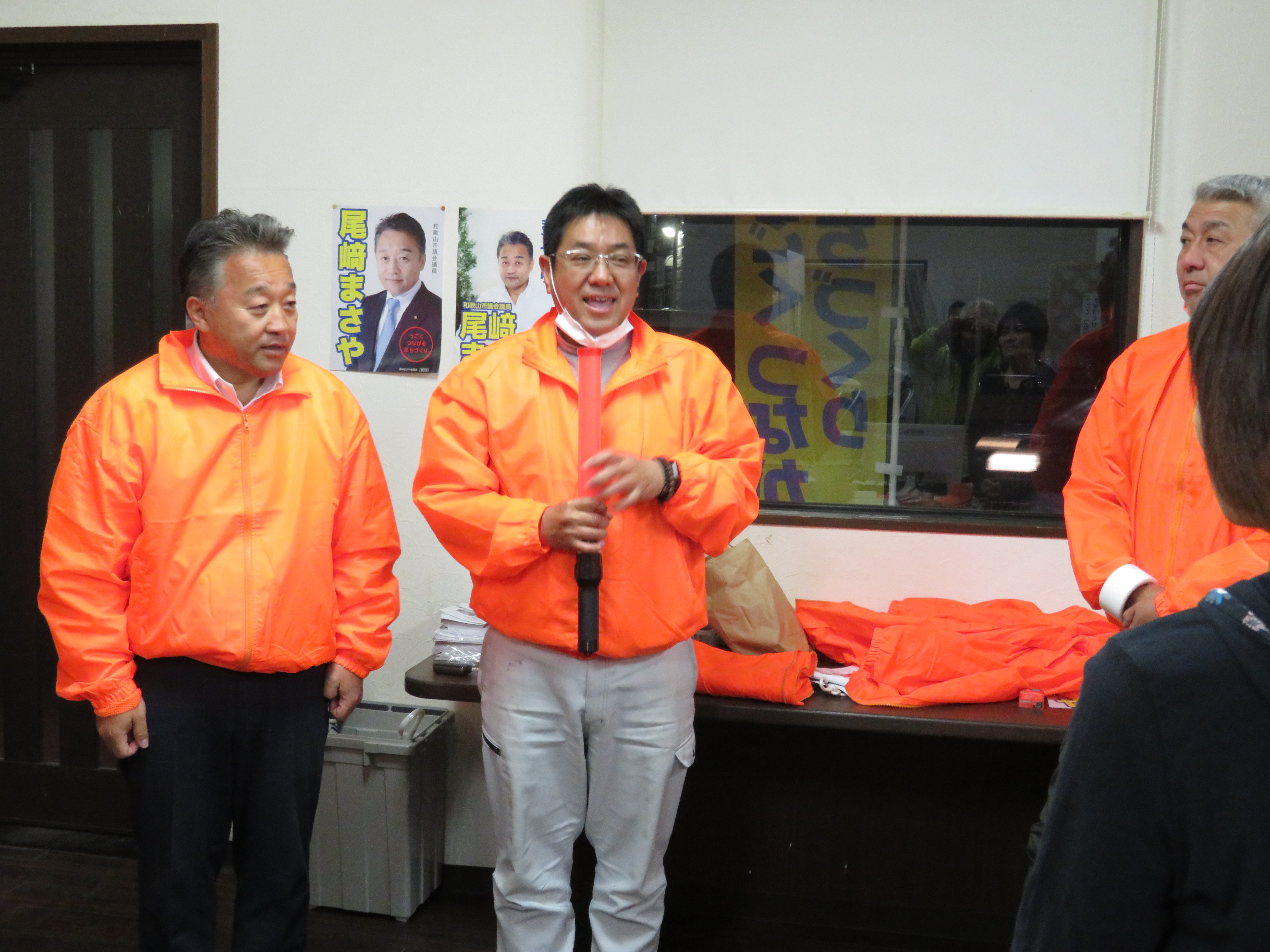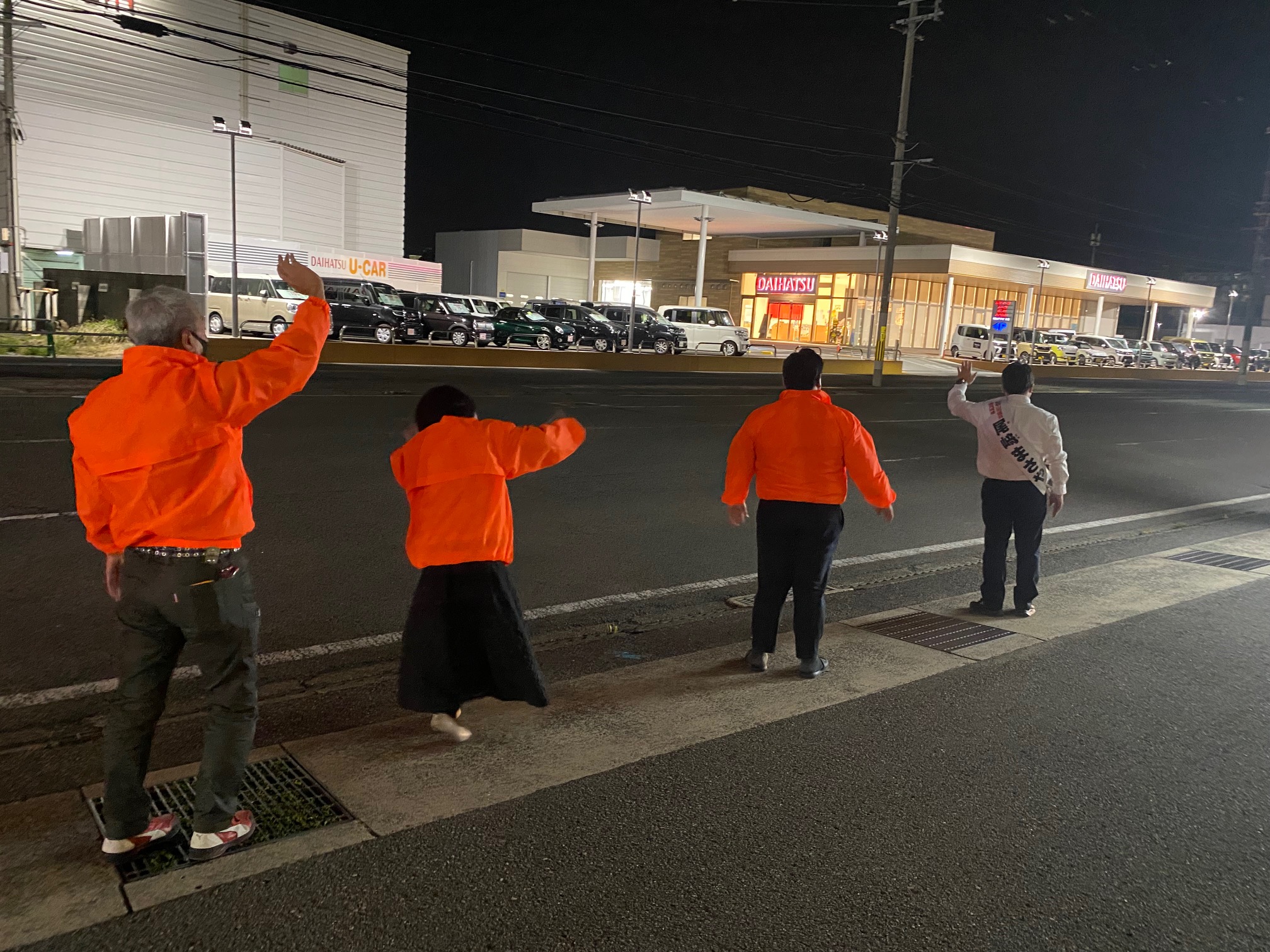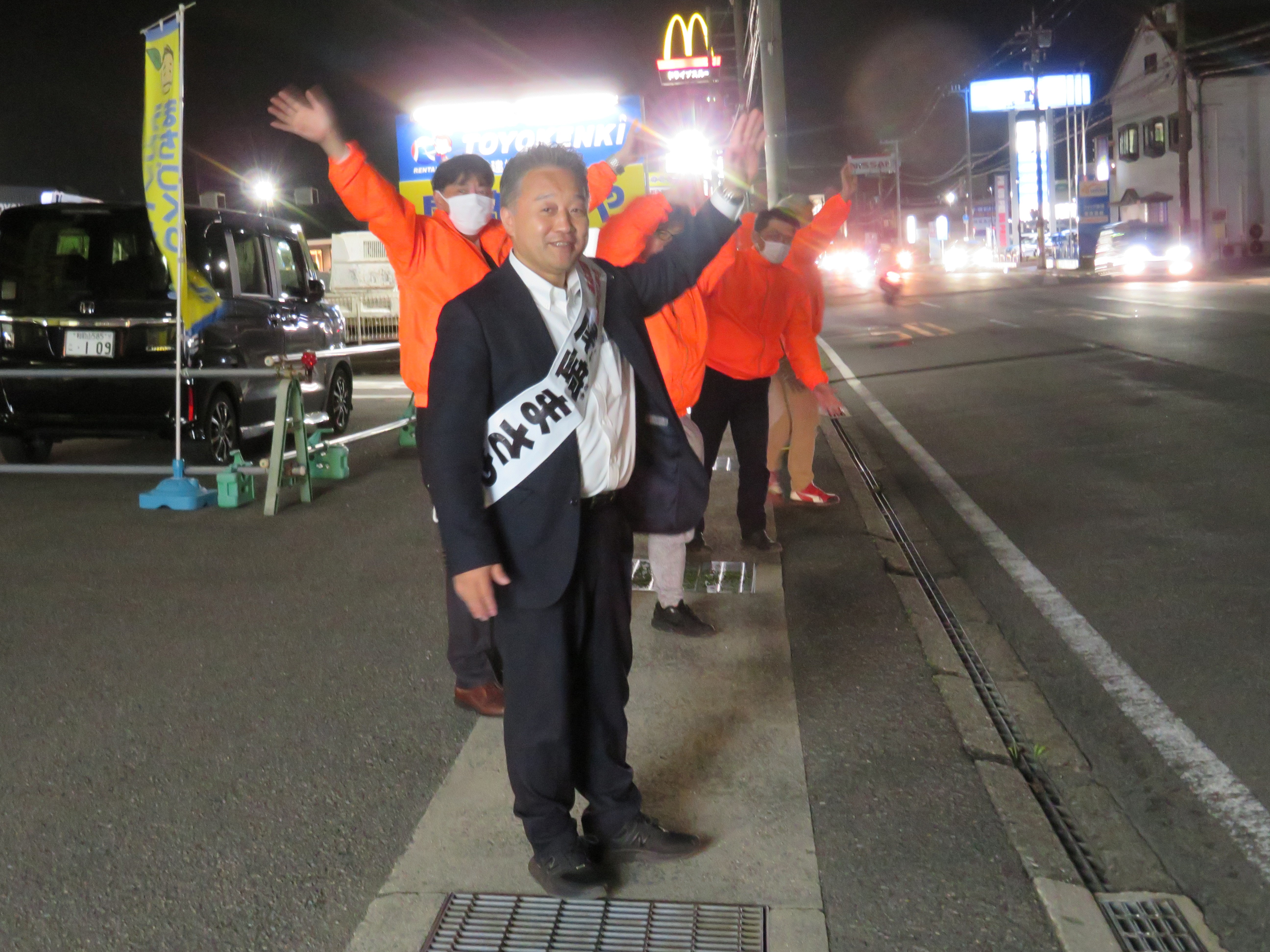 少し寒くなってきた夕闇の中、スタッフ一同、昨夜に続き尾﨑まさや候補者を先頭に、大浦街道沿いに出て手を振りました。候補者、スタッフ一同は、なおも元気です。手を振り続けていると街宣車が帰ってきました。