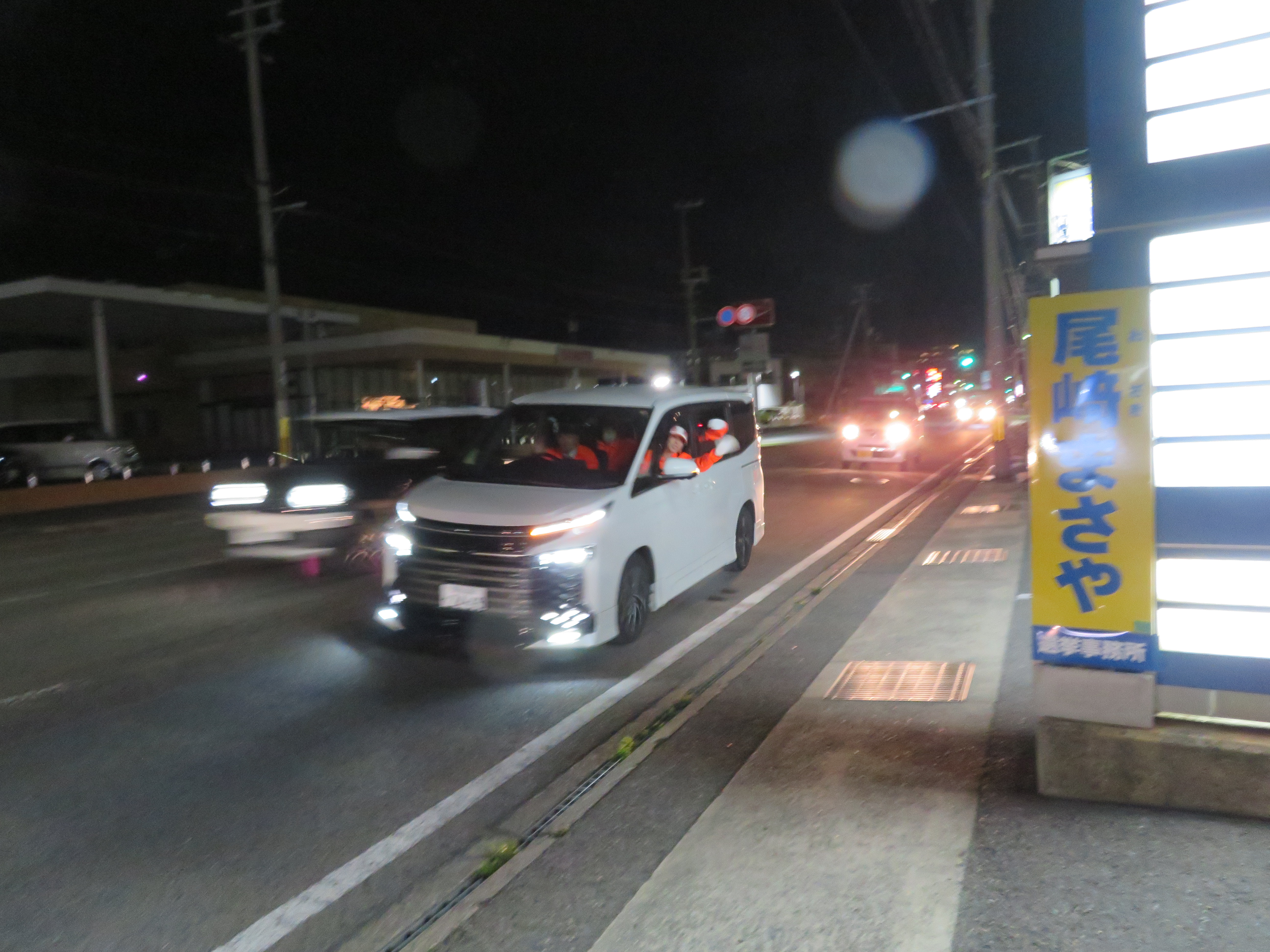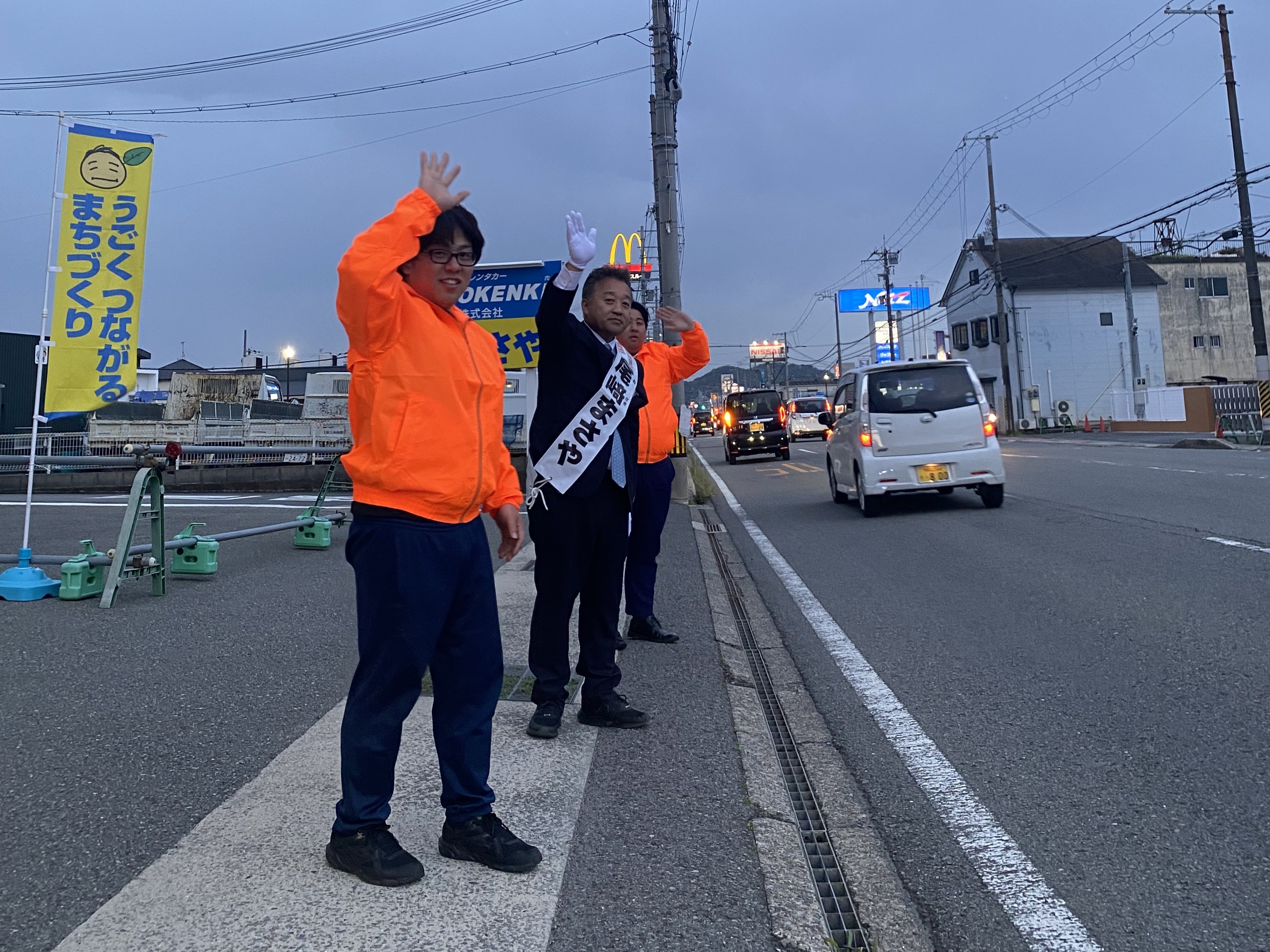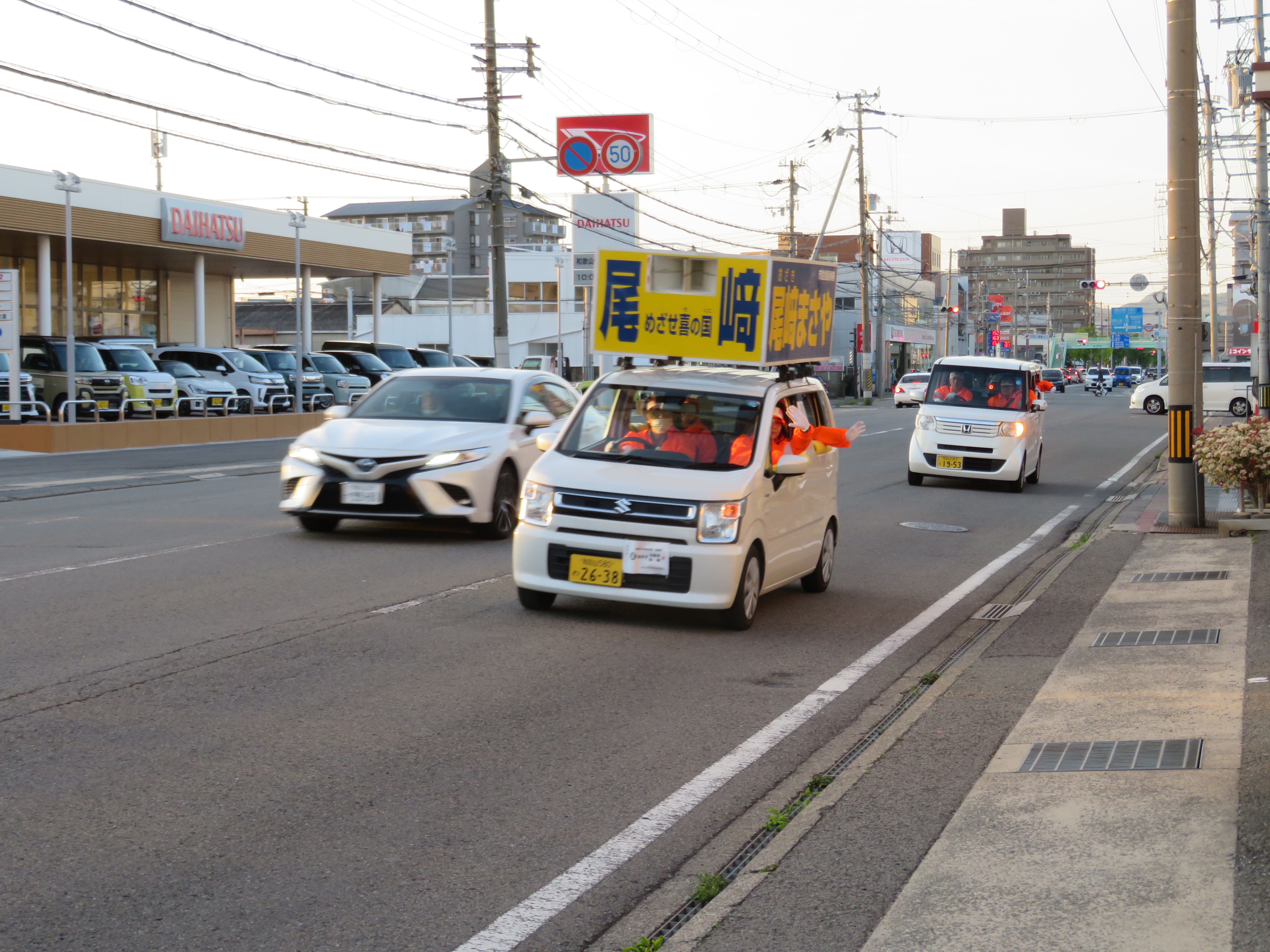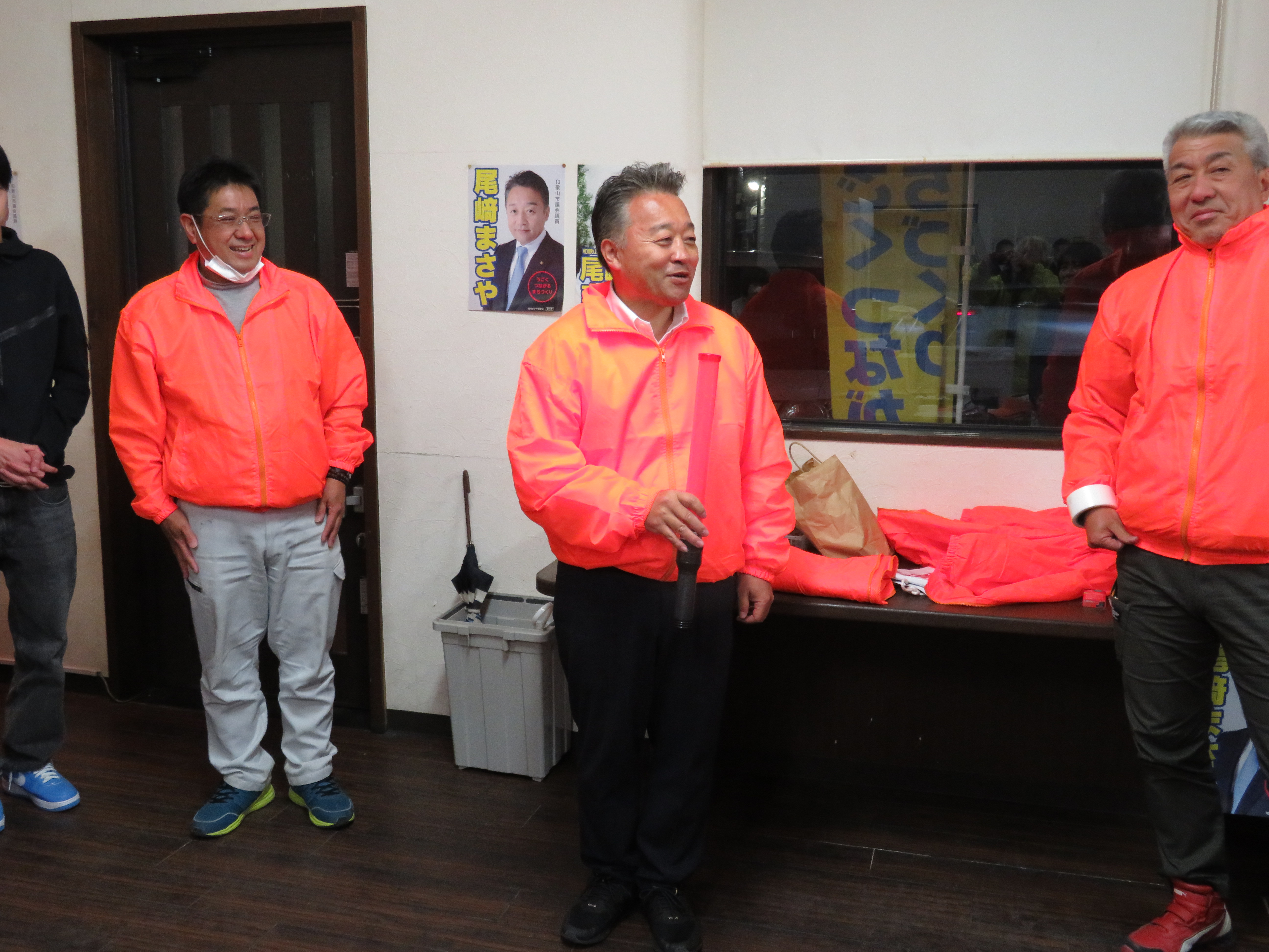 少し寒くなってきた夕闇の中、スタッフ一同、昨夜に続き尾﨑まさや候補者を先頭に、大浦街道沿いに出て手を振りました。候補者、スタッフ一同は、なおも元気です。手を振り続けていると街宣車が帰ってきました。