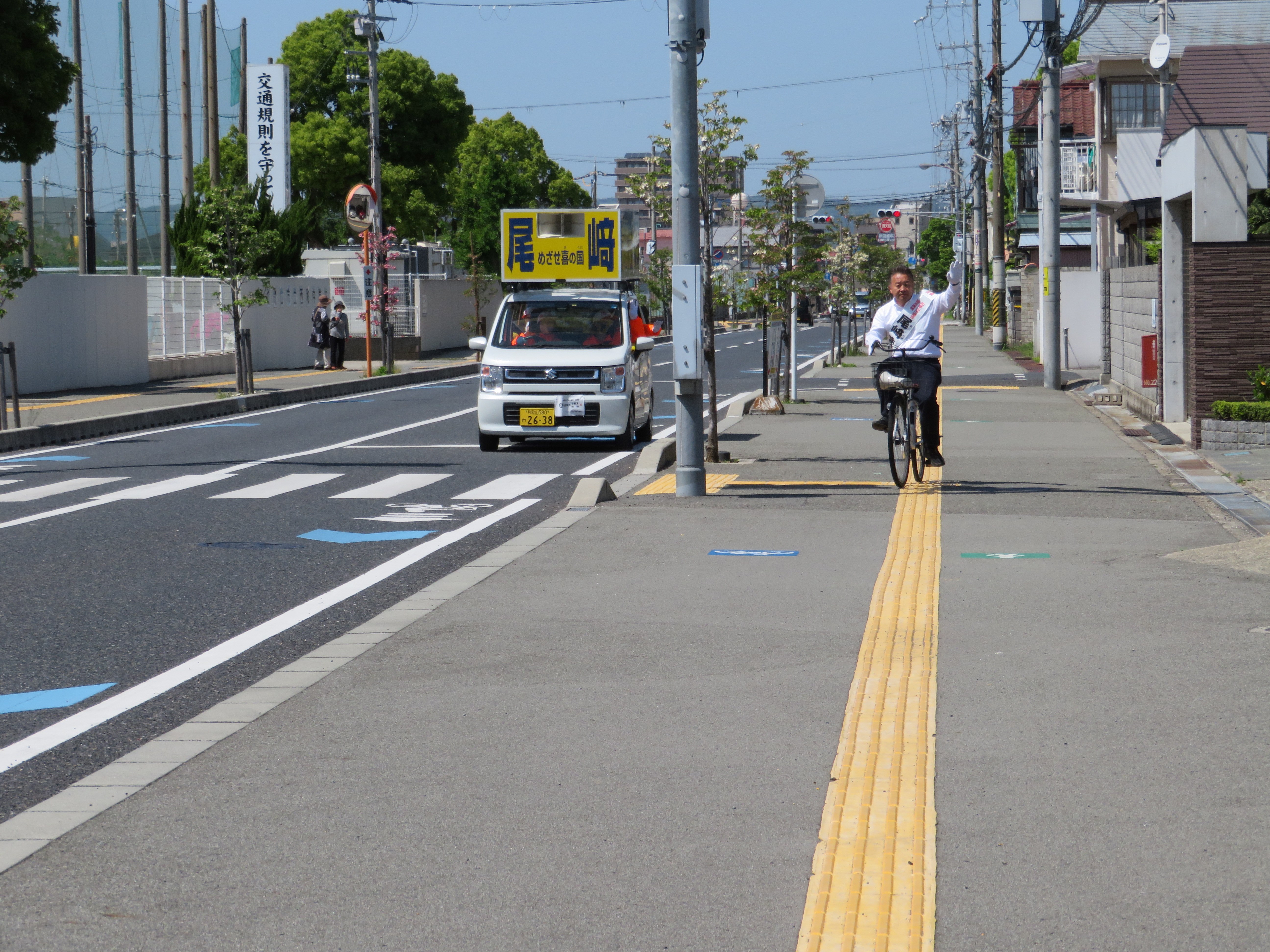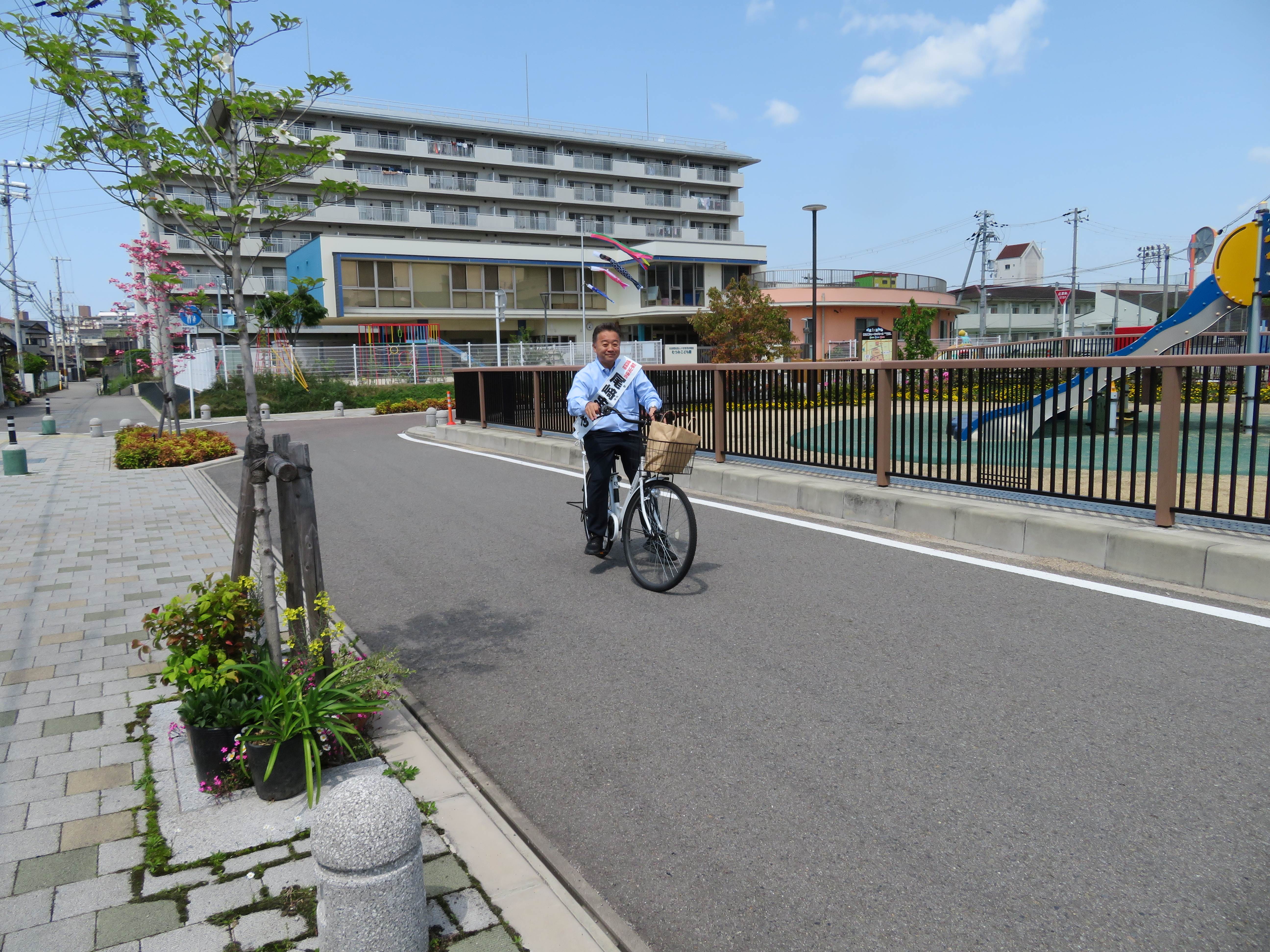 昼食後、突然、「自転車で少し廻ってくる。」と言って、タスキを掛け、運動員もつれず、自転車に飛び乗って走り出しました。カメラを持って追いかけたところ、砂山南地区に新しく開通したコミュニティ道路ではありませんか。砂山今福地区のまちづくりの成果と言える道路です。「尾﨑まさや候補」にとっても、まちづくり当初から関わりの深いところです。道路建設に当たって候補者は、むつみ保育園の移転に尽力され、和歌山市で初めてのコミュニティ道路の考え方に理解を示されました。