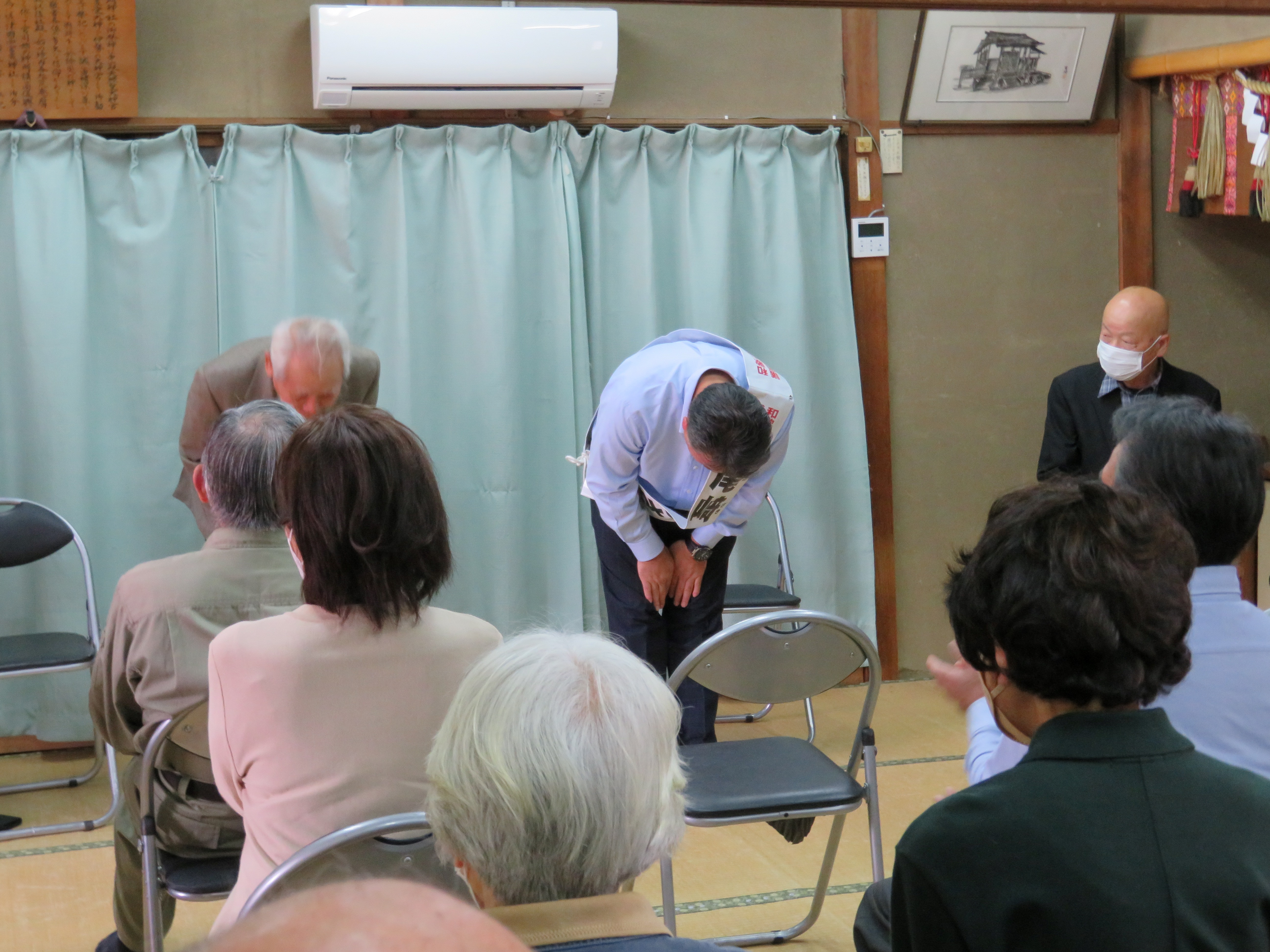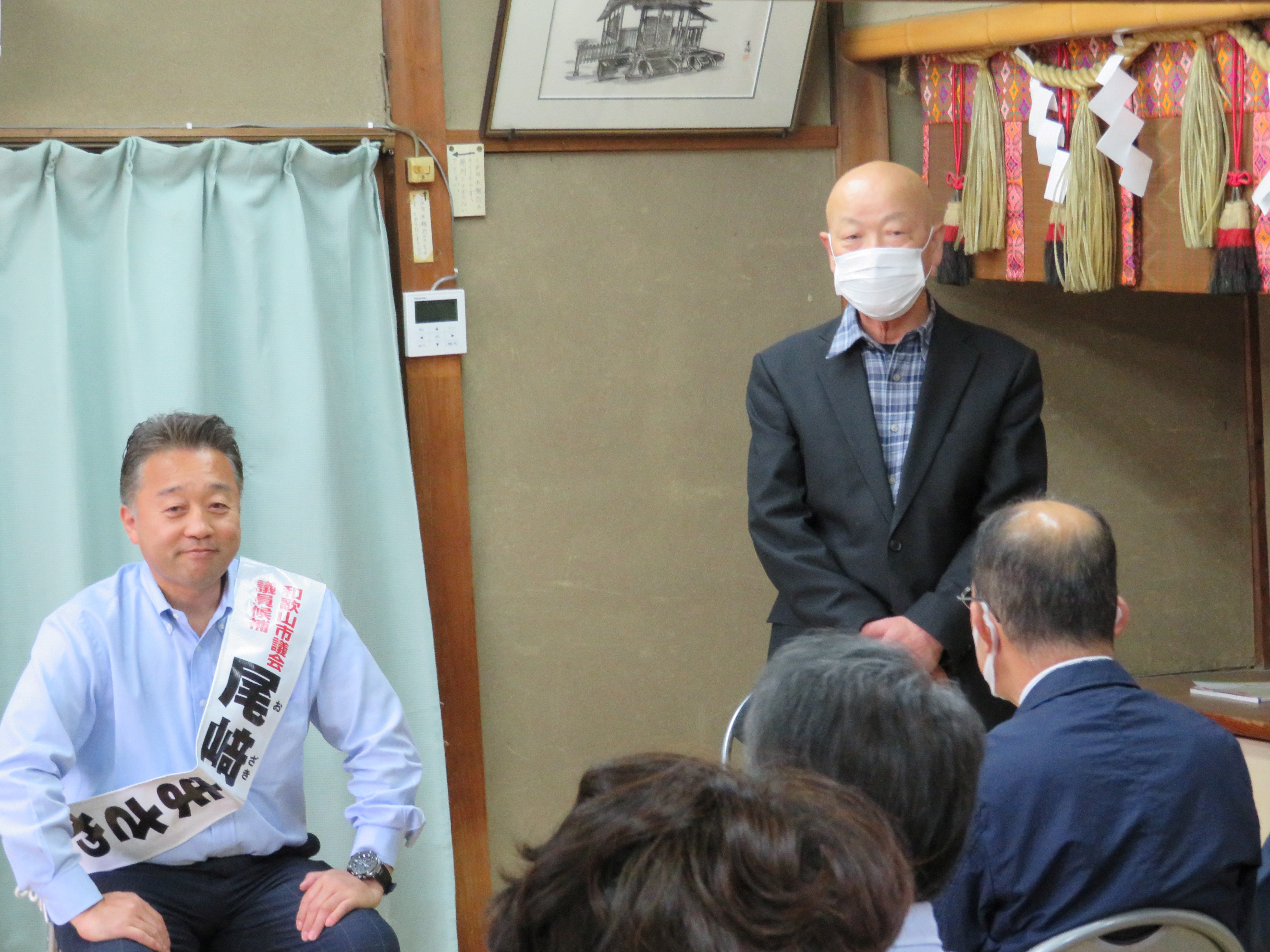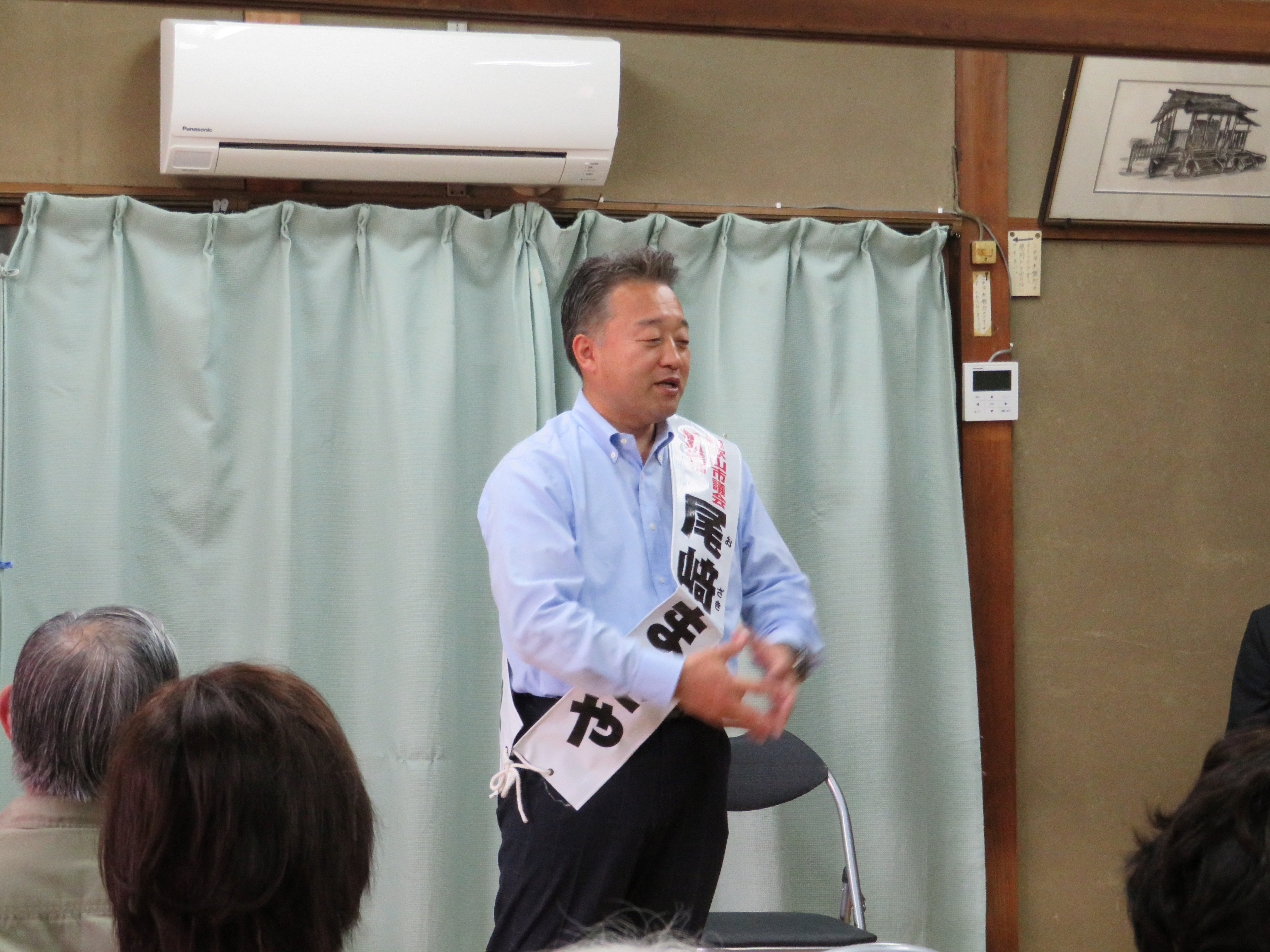 そのような由緒ある神明神社の参集所でミニ集会を開催しました。街宣車が午前中、ミニ集会のお知らせに廻りました。神社前の通りは、現在、事業中である都市計画道路今福神前線で、用地買収も進んでおります。その様子を見ているうちに「尾﨑まさや候補者」が街宣車に乗り到着しました。参集所では地区の方々により椅子の設置などが進められ、候補者の到着を待つばかりになっていました。候補者が拍手で迎えられました。