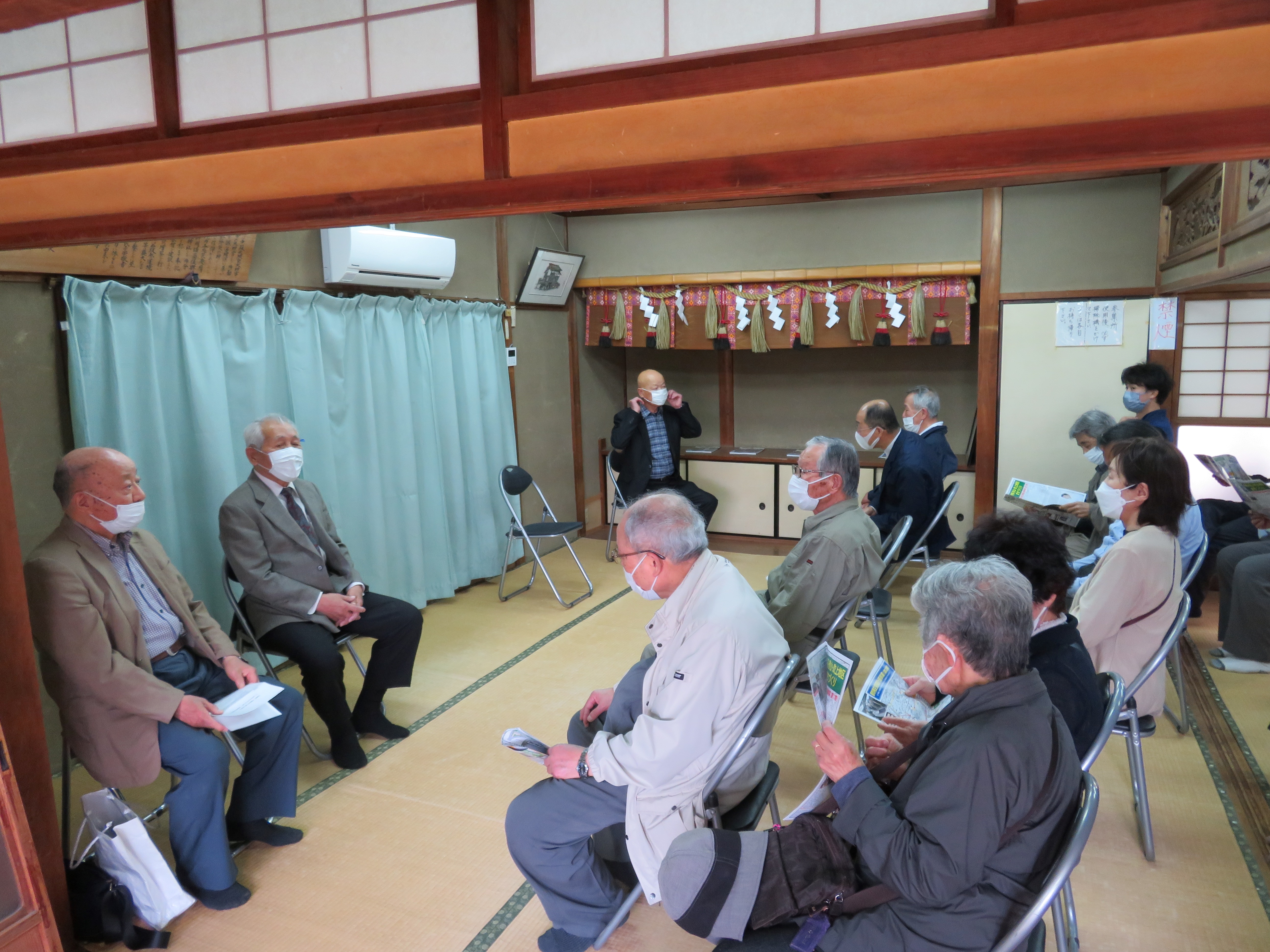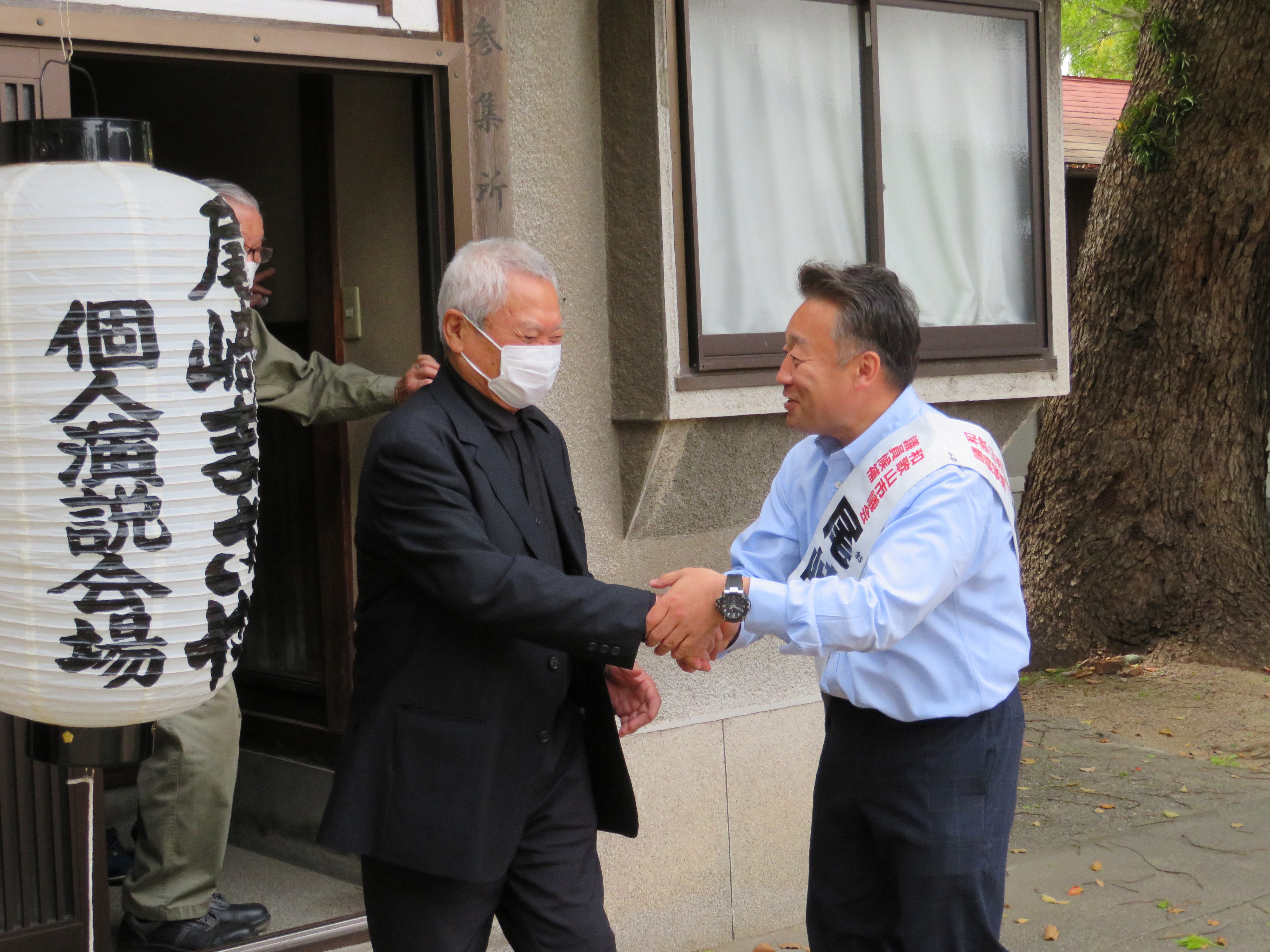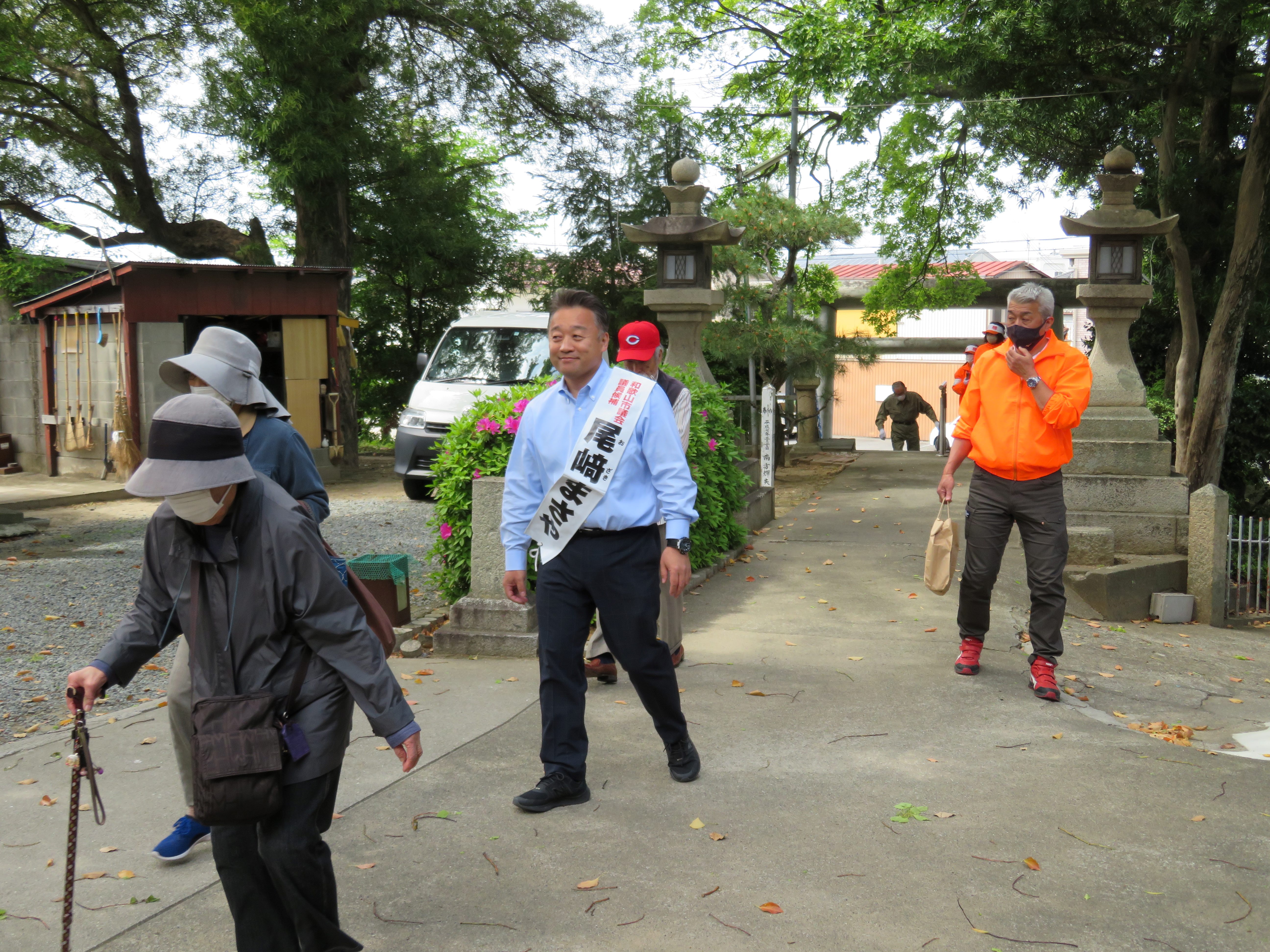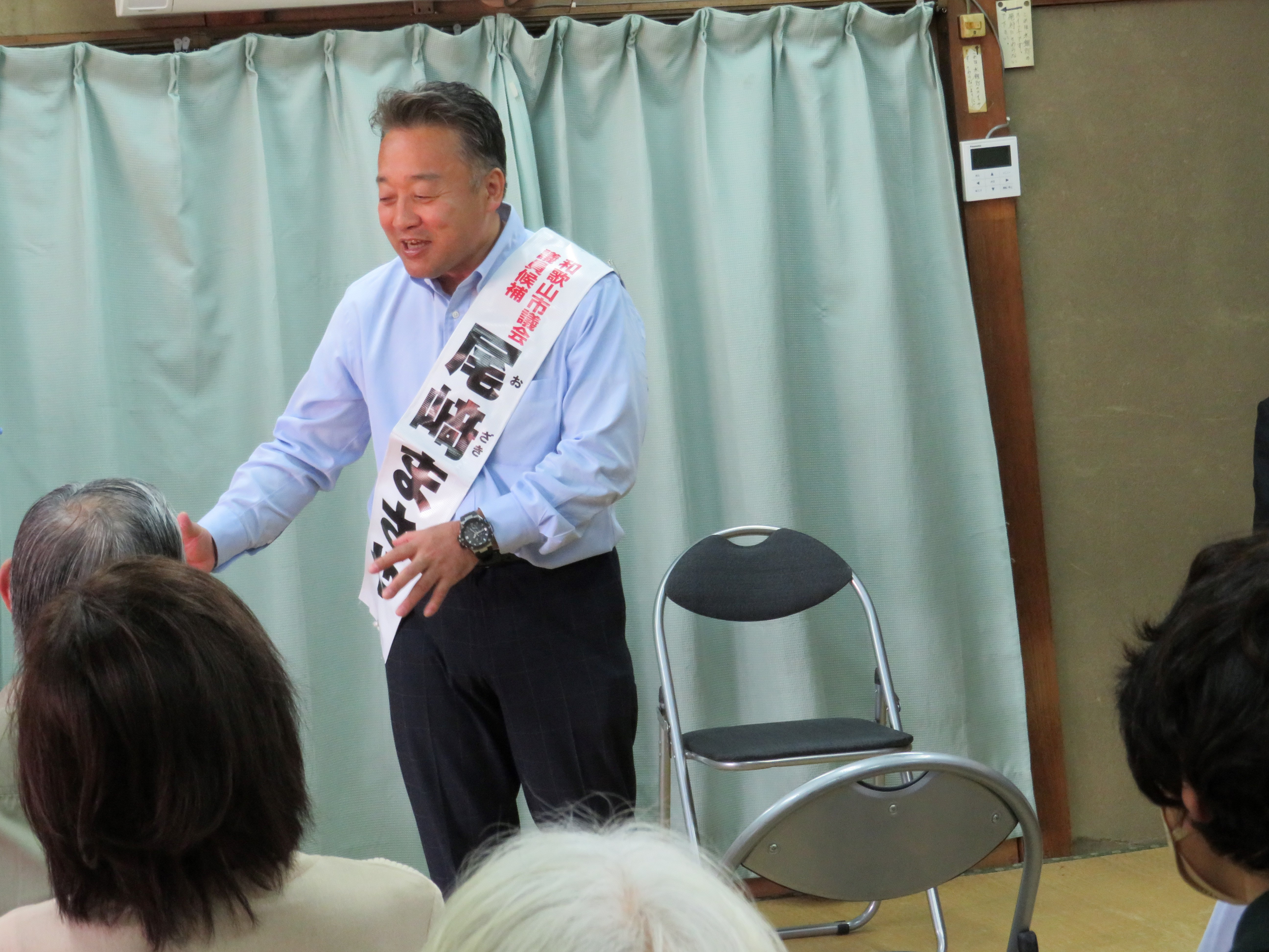 そのような由緒ある神明神社の参集所でミニ集会を開催しました。街宣車が午前中、ミニ集会のお知らせに廻りました。神社前の通りは、現在、事業中である都市計画道路今福神前線で、用地買収も進んでおります。その様子を見ているうちに「尾﨑まさや候補者」が街宣車に乗り到着しました。参集所では地区の方々により椅子の設置などが進められ、候補者の到着を待つばかりになっていました。候補者が拍手で迎えられました。