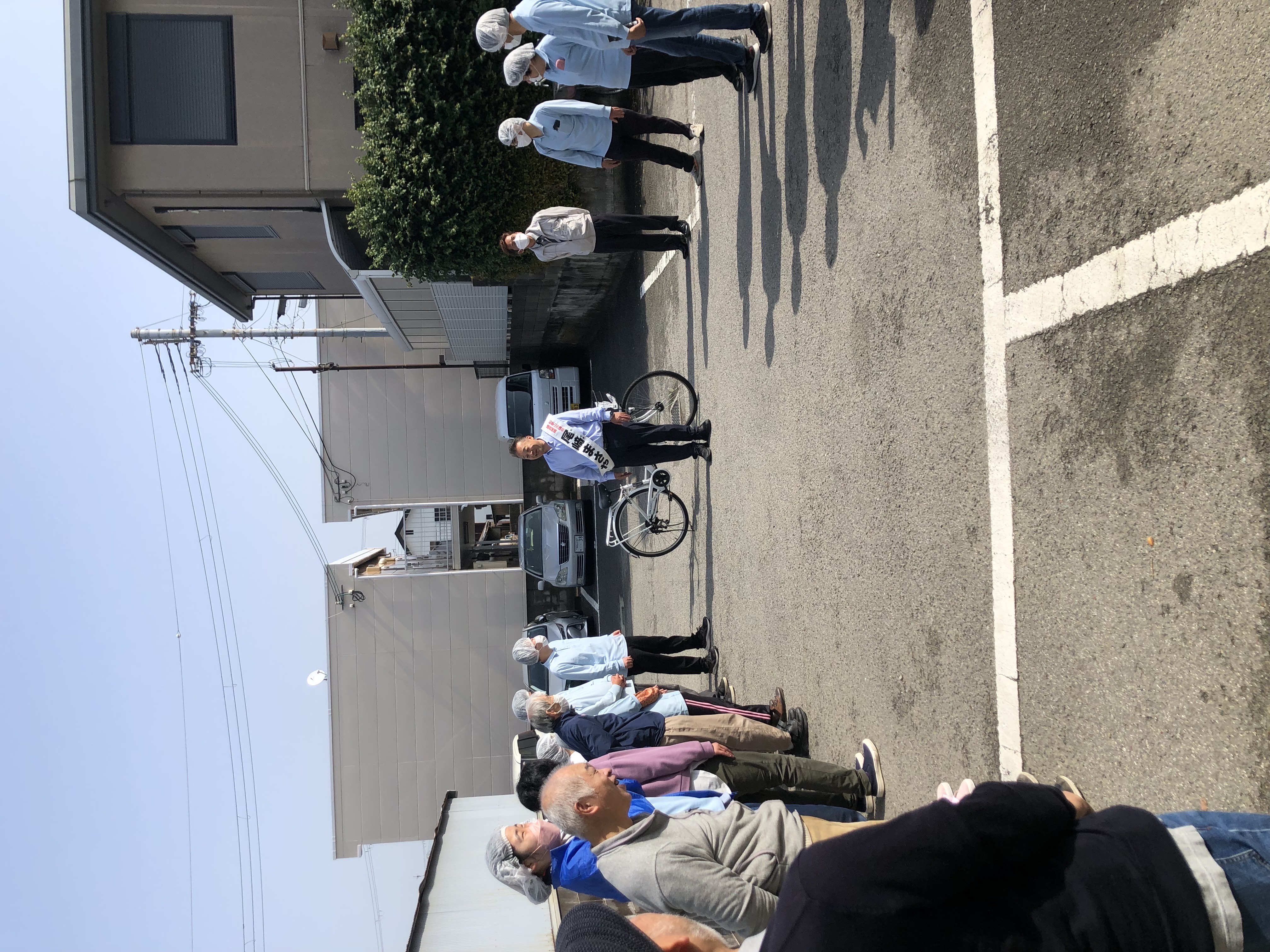 今福地区にある会社の朝礼に呼ばれました。自転車で会社に到着すると「街宣車で来ると思いましたのに。」と言われ、「それではもう一度、再登場します。」と言って、颯爽と皆さんの前を走り、所定の場所に到着しました。笑顔で皆さんに挨拶した後、身振り手振りを交え、演説を行いました。
