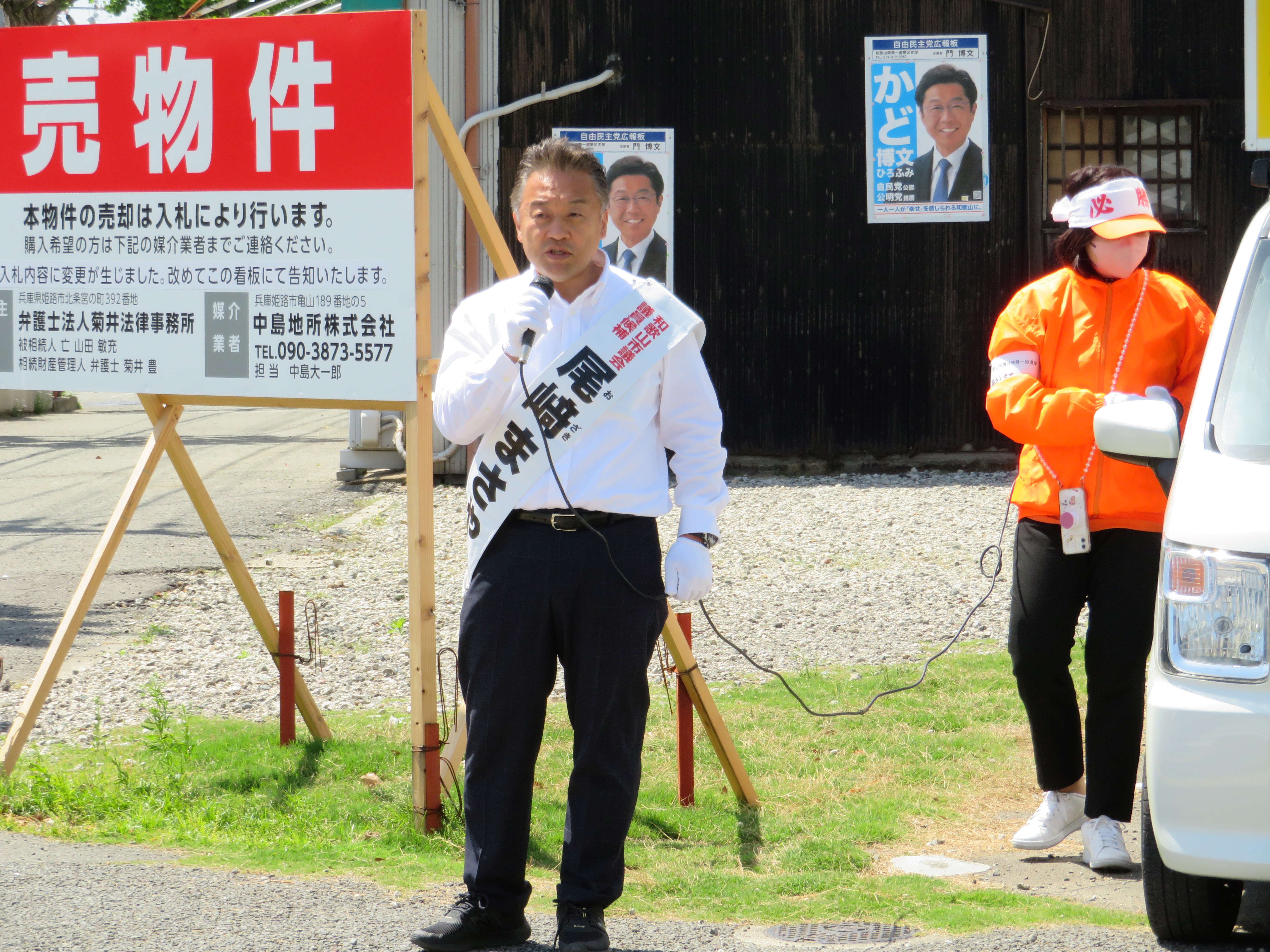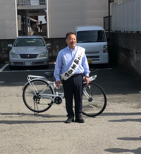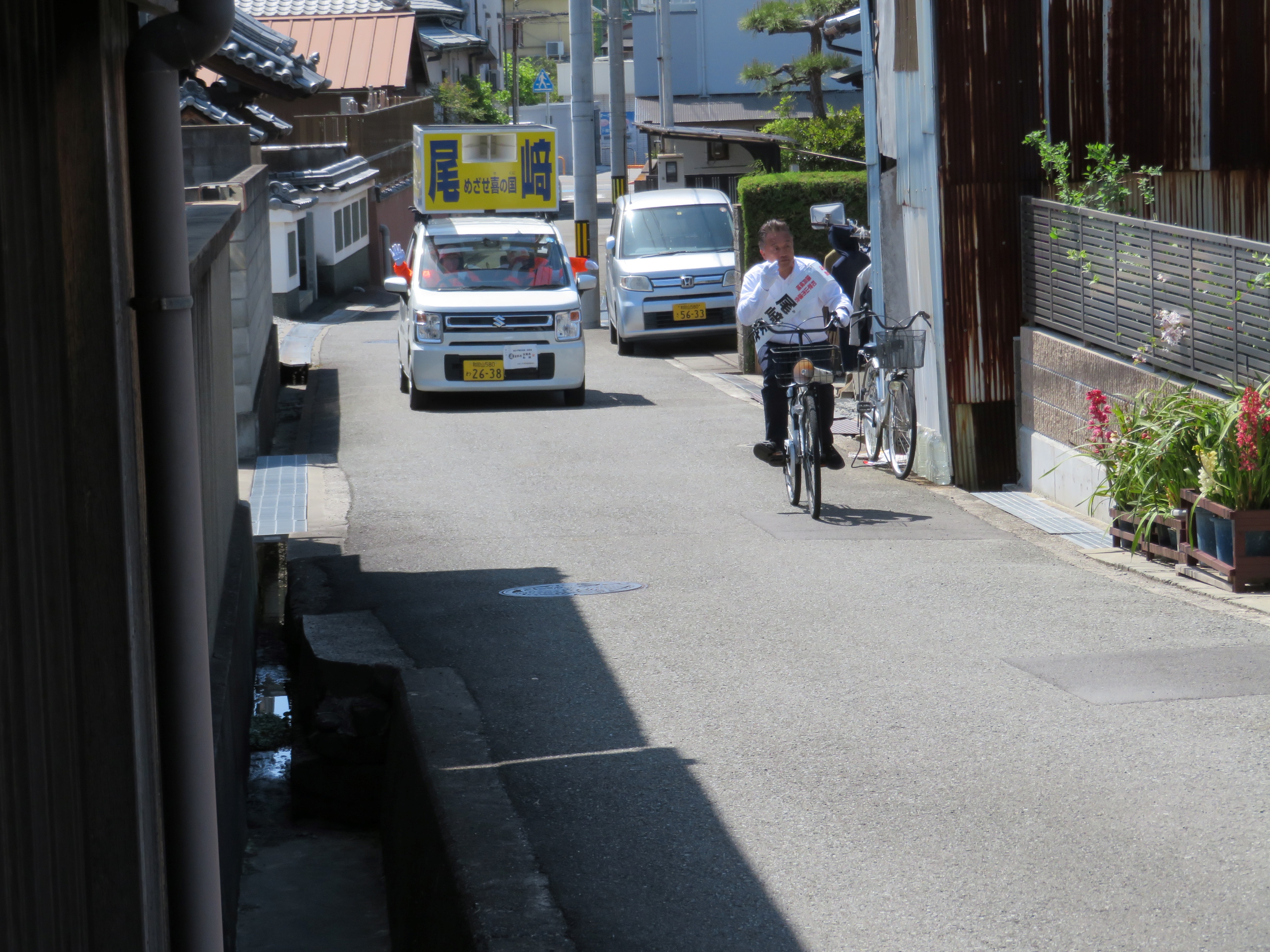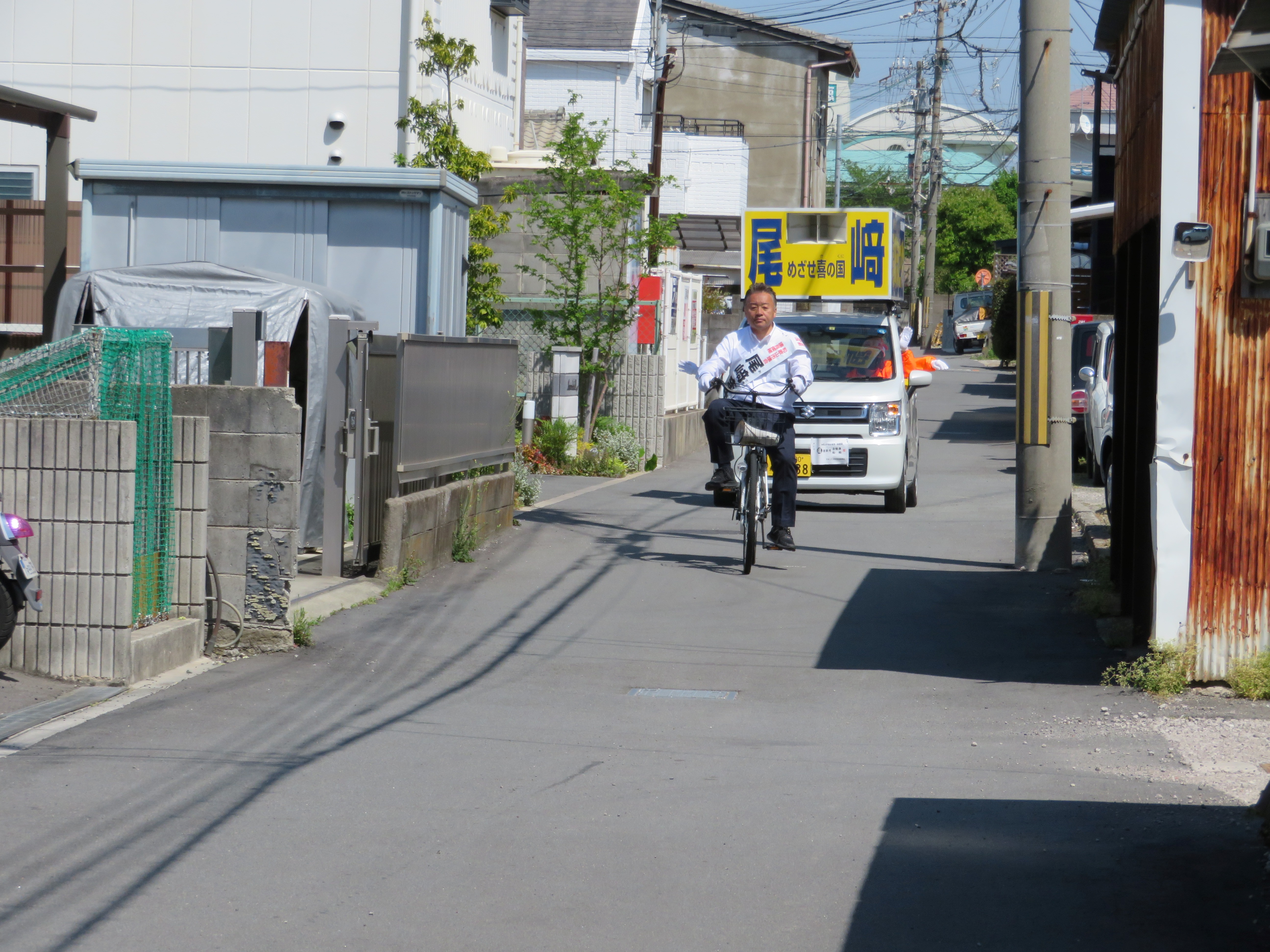 ただいま「尾﨑まさや候補者」が自転車に乗り、砂山のまち中へ飛び出しました。出会われた方は、声援、よろしくお願いします。砂山地区から今福地区を経て吹上地区を走りました。走っていると家から出てきてくれる支持者もおり、一時停車して、支持者と話をしておりました。余談ですが、カメラマン君、当年とって68歳、走るのにも限界があり、途中でリタイアしました。