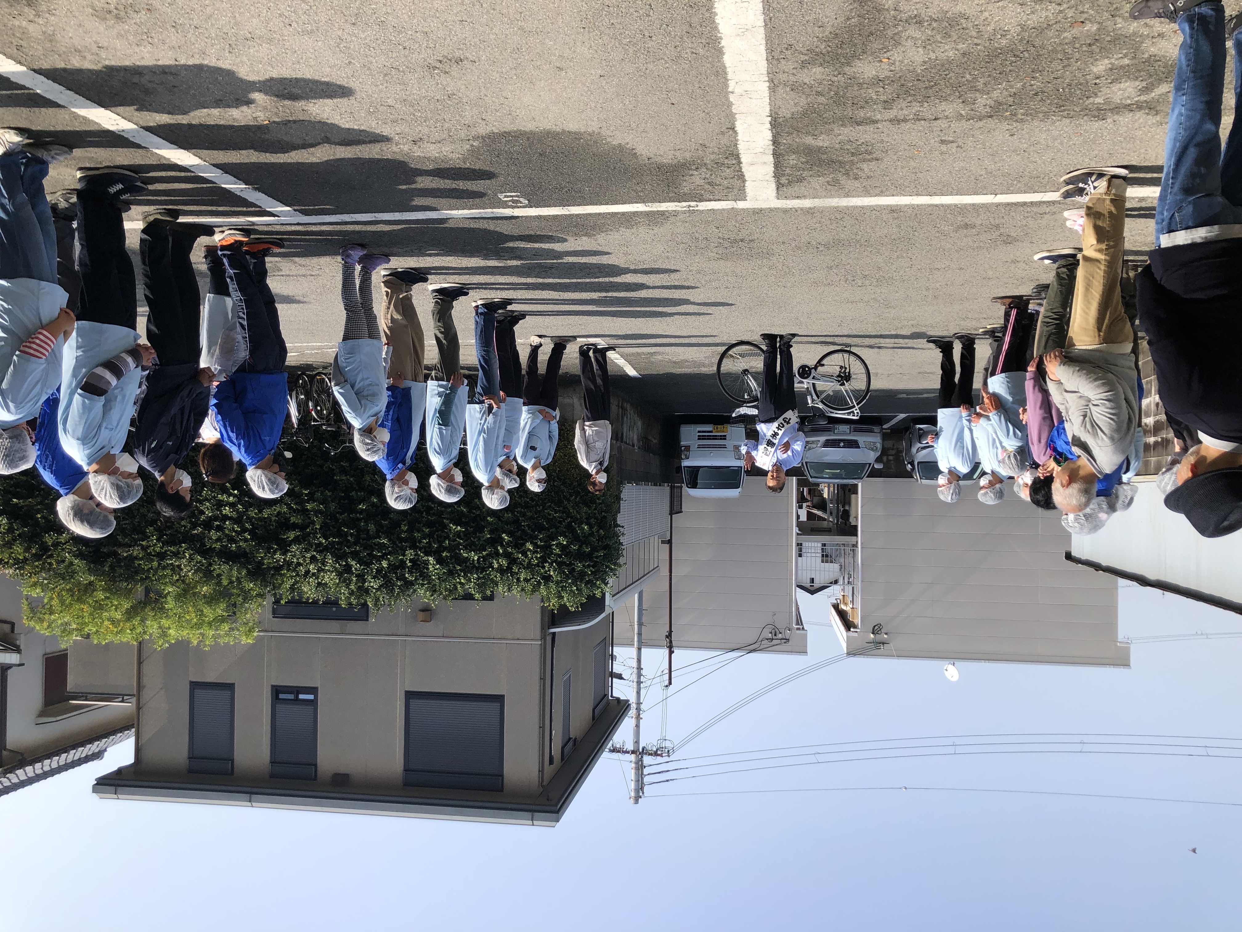 いよいよまち歩きが始まりました。先導するのは自治会長の小西さん。