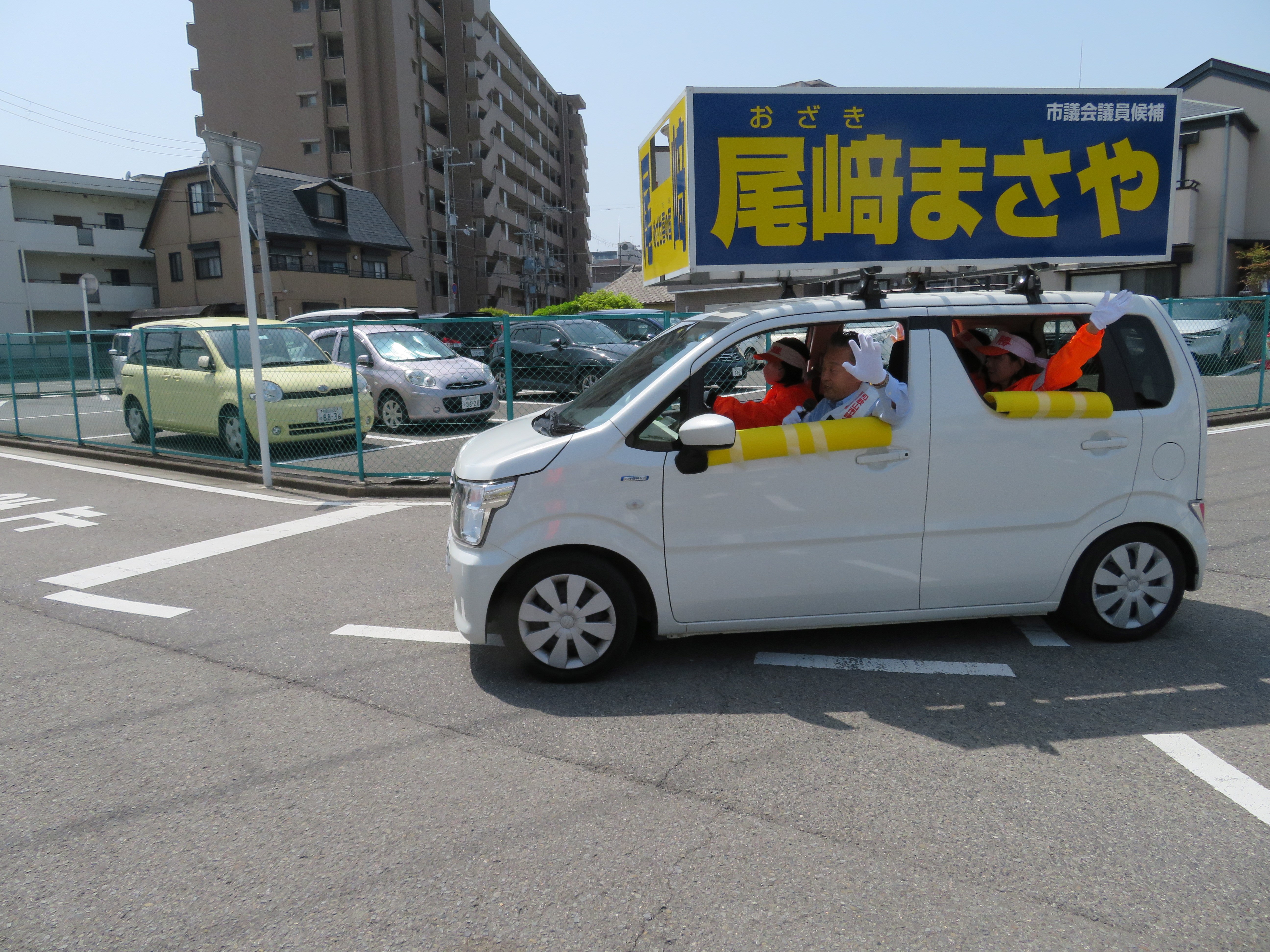 街宣車に乗り尾﨑まさや候補者が到着しました。
