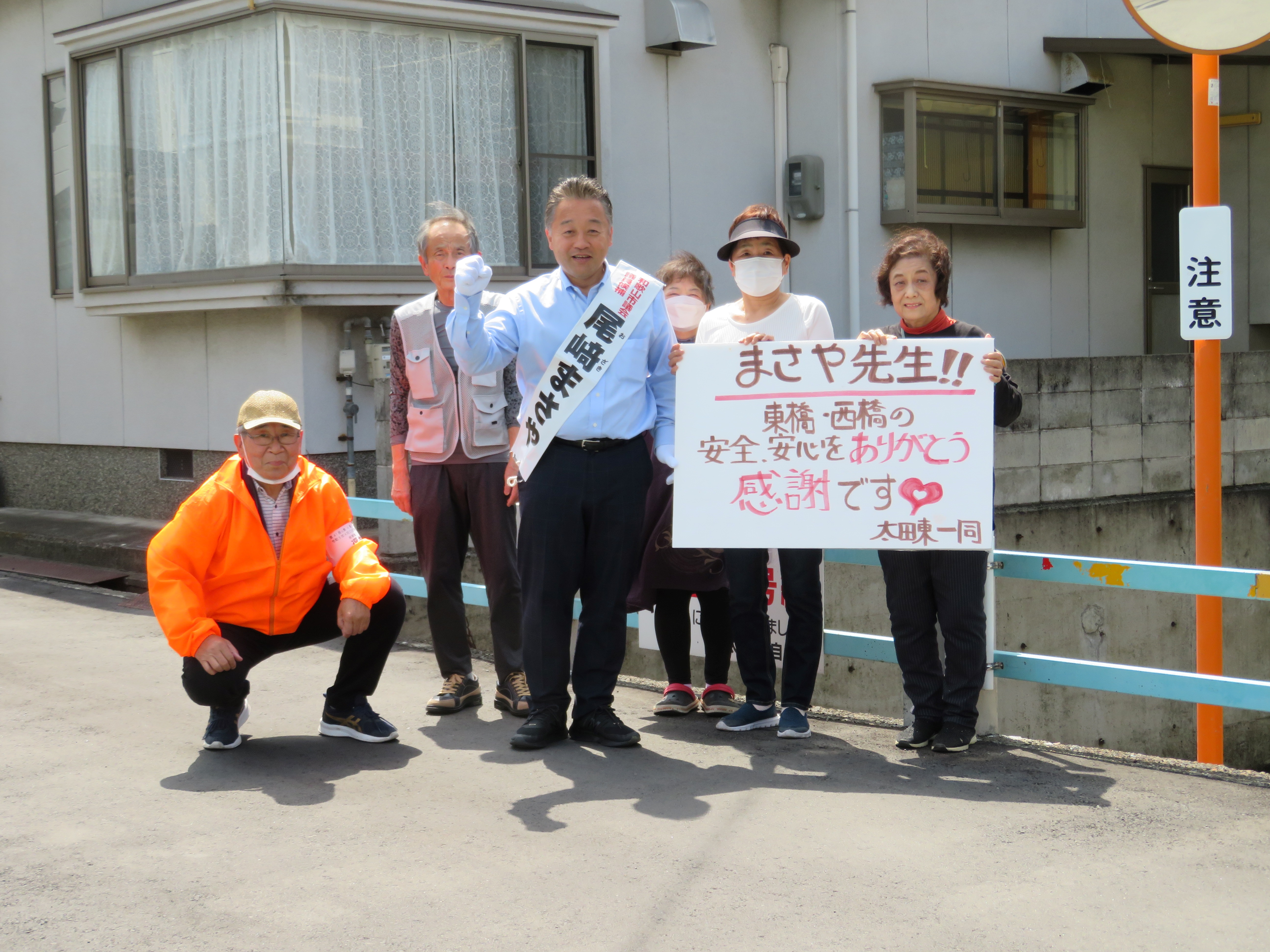 豊臣秀吉の3大水攻め(備中高松城、武蔵忍城、紀州太田城)の一つ、太田城。大門、南大門、西北門を構える平城でありながら強固な城造りであったと言われる太田城。現在の来迎寺がその本丸跡と言われています。来迎寺の東、旧大門川の東に広がる太田東自治会を訪ねました。「尾﨑まさや候補者」は、旧大門川にかかる老朽化した橋梁や道路構造物に対して、太田東自治会役員の方々の問題提起と長年にわたるご尽力、周辺住民の皆様のご理解、ご協力、候補者の市議会での災害時での問題の指摘などで、橋梁とその周辺の私道を和歌山市が引き取ることになりました。その結果を受け、「太田東東橋」の補修工事が始まりました。候補者は、「地域の課題に問題意識を持って主体的、献身的に取り組まれた太田東自治会役員の方々の姿勢に感服、感心させられたと同時に共に解決に向け取り組むことができた経験は、私にとっても貴重なものになりました。」と述懐しております。それではまち歩きの様子を御覧ください。