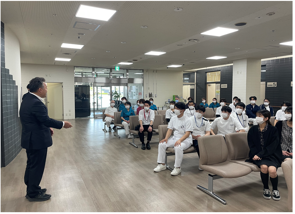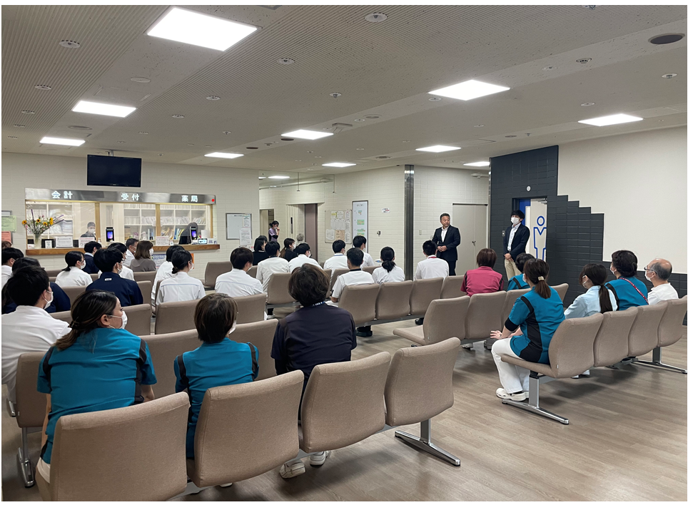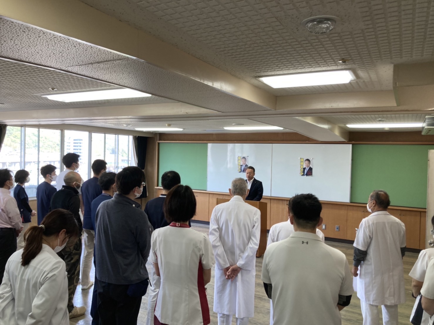 日頃、お世話になっている病院へ、皆さんにご挨拶をする機会をいただき伺いました。昼一番のまち歩きの疲れが残り、言葉がうまく紡ぎ出せず、昼間は走り回り汗が出て、今回は冷や汗です。いずれにしましても、多くの方々にお集まりいただいて感謝、感謝です。