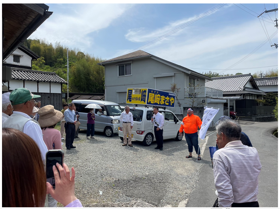 奥須佐地区は、伊太祁曽神の西、南西に位置し、和田川の上流域にあたります。地区の中央を県道岩出海南線が通り、平安時代中頃から始まった熊野詣により、奥須佐地区は熊野の古道の紀州路ルートとなり沿道には奈久智王子が残っています。地区には老朽化した様々な構造物があり、地区の課題として候補者へ要請があります。候補者は、地区の方々とそれらの課題に対し、地区の方々と協働して取り組み、解決へ向け導くことができました。街頭演説会にはたくさんの方々が参集していただき、感激した次第です。