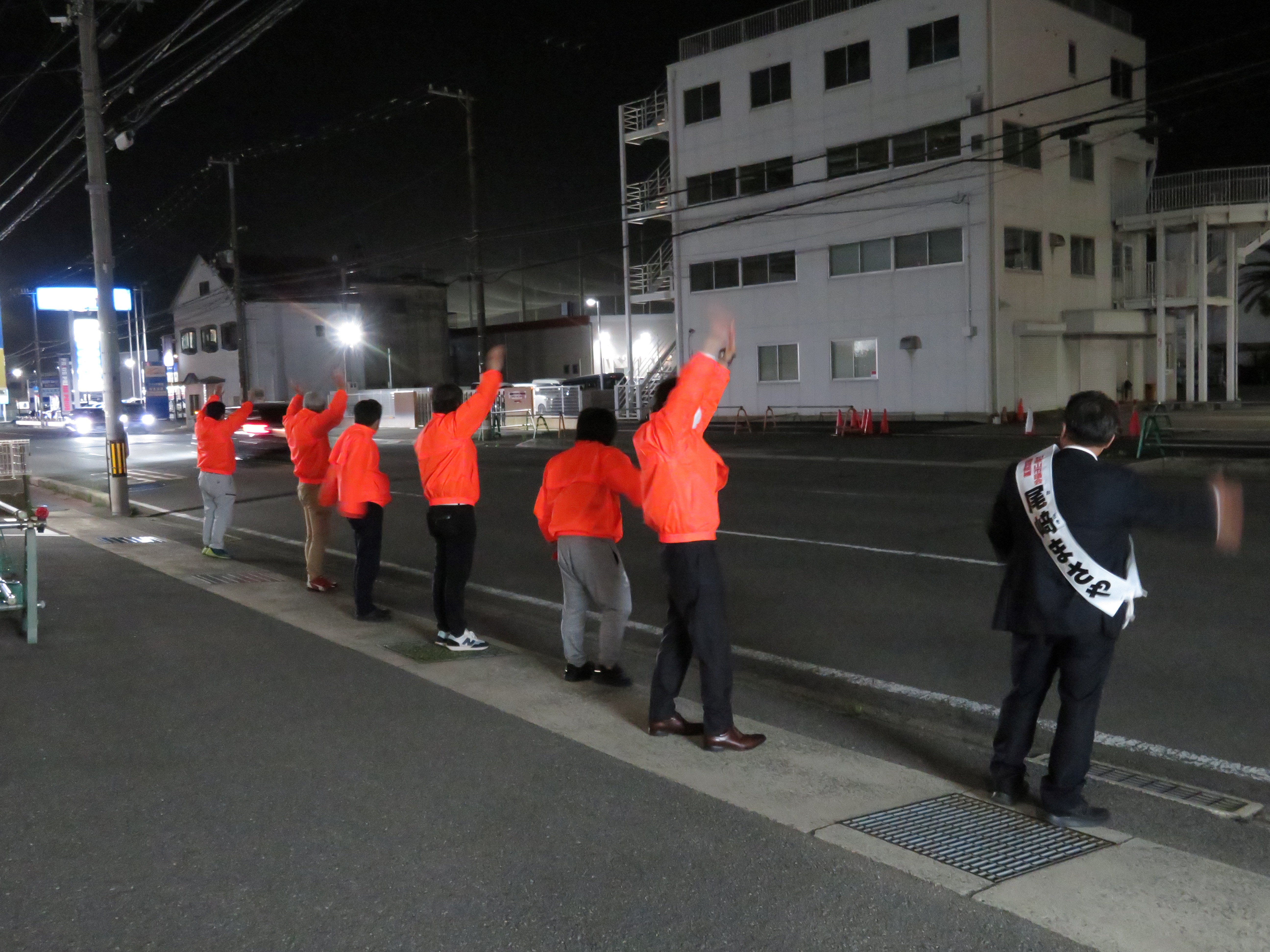 スタッフ一同が暗くなった大浦街道沿いに整列。尾﨑まさや候補者を先頭ににこやかに手を振ります。候補者を含め、まだまだ元気です。