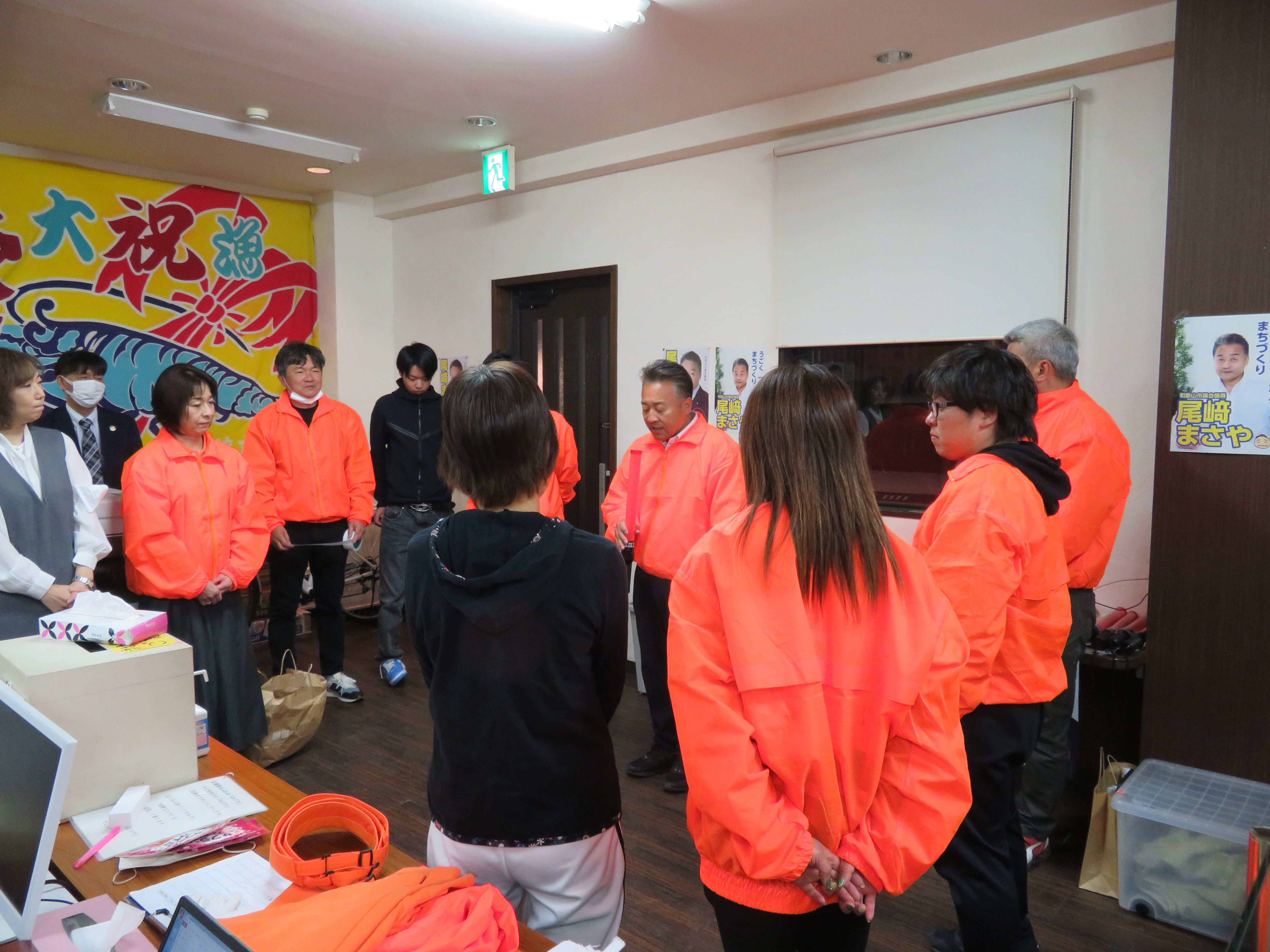 街宣車に乗って飛び出した「尾﨑まさや候補者」が帰ってきました。夜になり、寒さが増す中、ワイシャツ一枚でタスキを掛け、マイクを持ち、時間いっぱいまでうったえました。力いっぱい頑張った一週間でした。事務所に入ると震えていました。事務局長の挨拶に続き、「尾﨑まさや候補者」の運動員、事務員の皆様に労を謝し、感謝の言葉を述べられました。これにて、この度の選挙運動はすべて終了しました。皆様方の熱いご声援とご協力に感謝する次第であります。有難う御座いました。